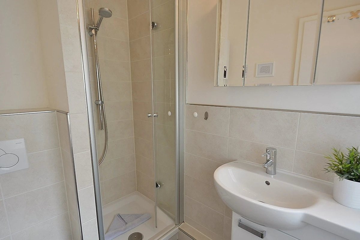 Modernes, hochwertiges, gefliestes Tageslichtbad mit Dusche, Waschbecken und WC.