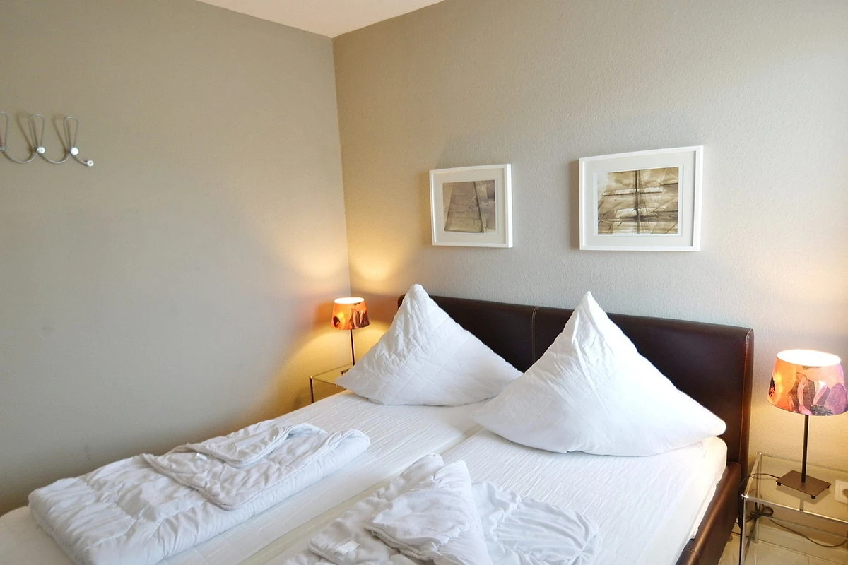 Im modernen, freundlichen Schlafzimmer befindet sich ein Doppelbett (2x 90x200cm). Ein 3-türiger Kleiderschrank befindet sich im Flur. Das Schlafzimmer ist mit Laminatboden ausgelegt. Das Fenster zum Laubengang lässt sich durch eine Aussenjalousie vollständig verdunkeln.
