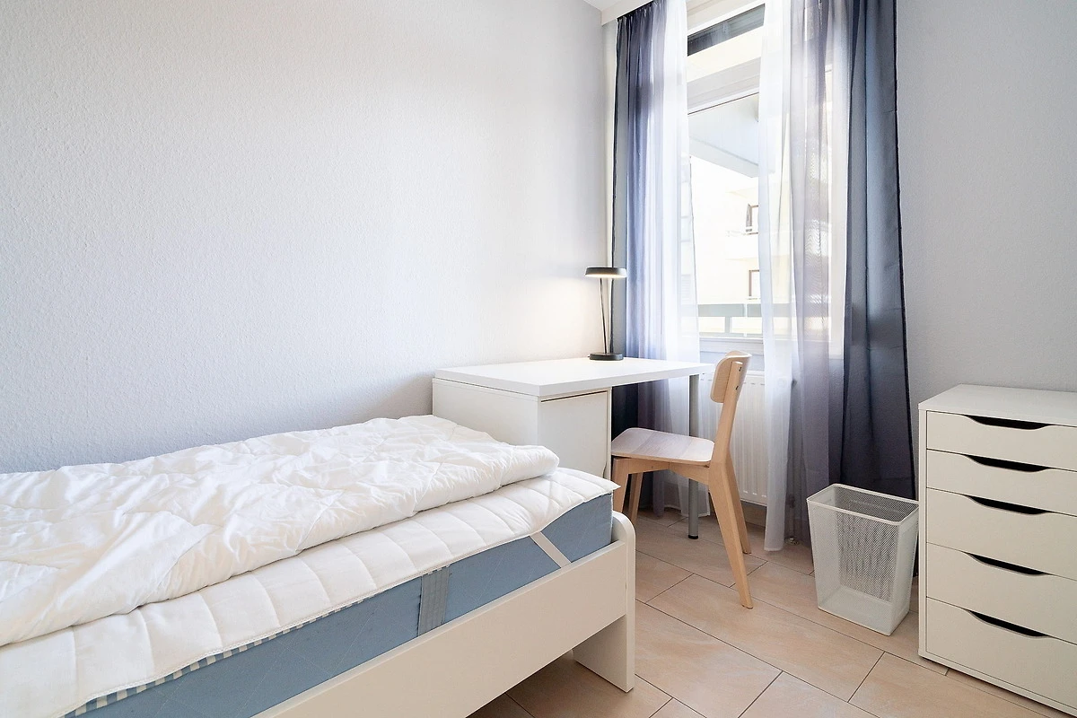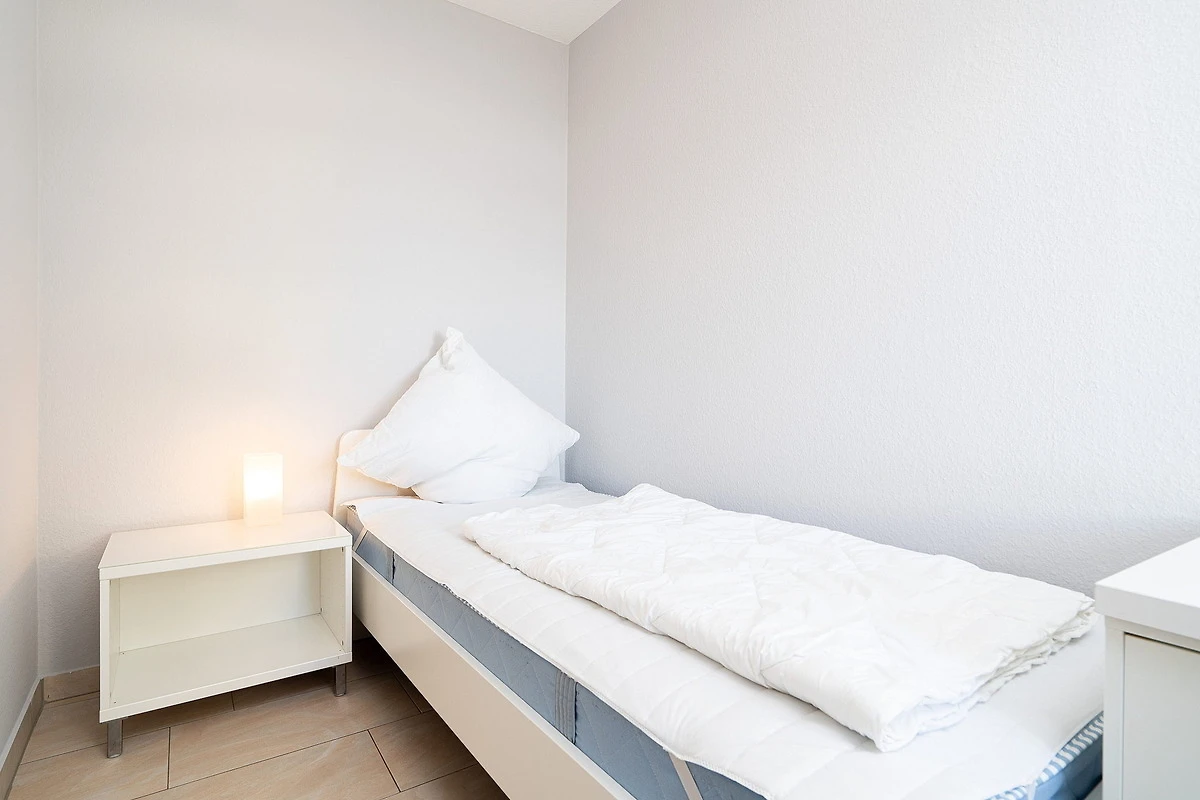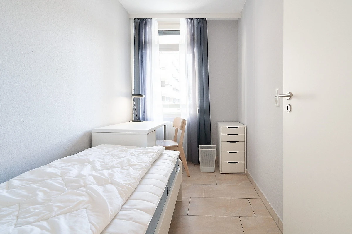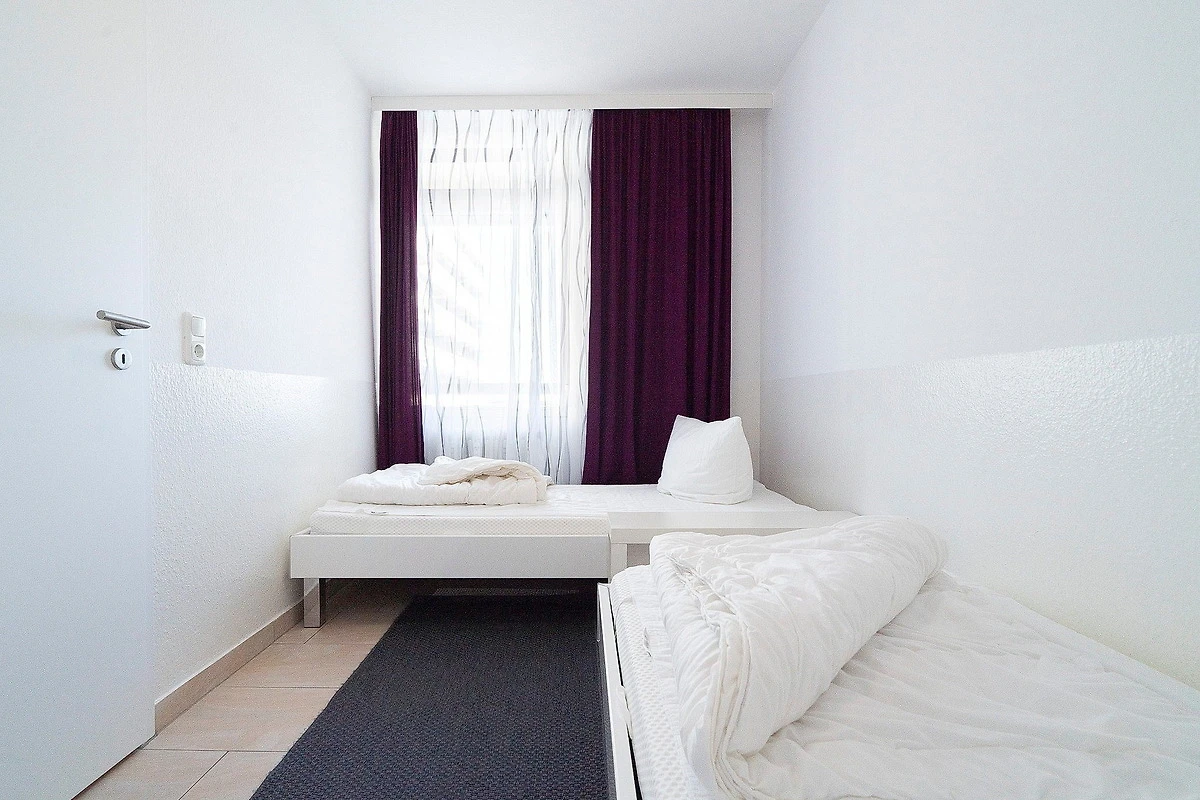 Separates gefliestes Kinderzimmer mit Fenster zum Laubengang. Das Fenster lässt sich durch einen Aussenrollladen vollständig verdunkeln. Das Kinderzimmer ist ab 2024 mit einem Einzelbett und einem Schreibtisch ausgestattet.