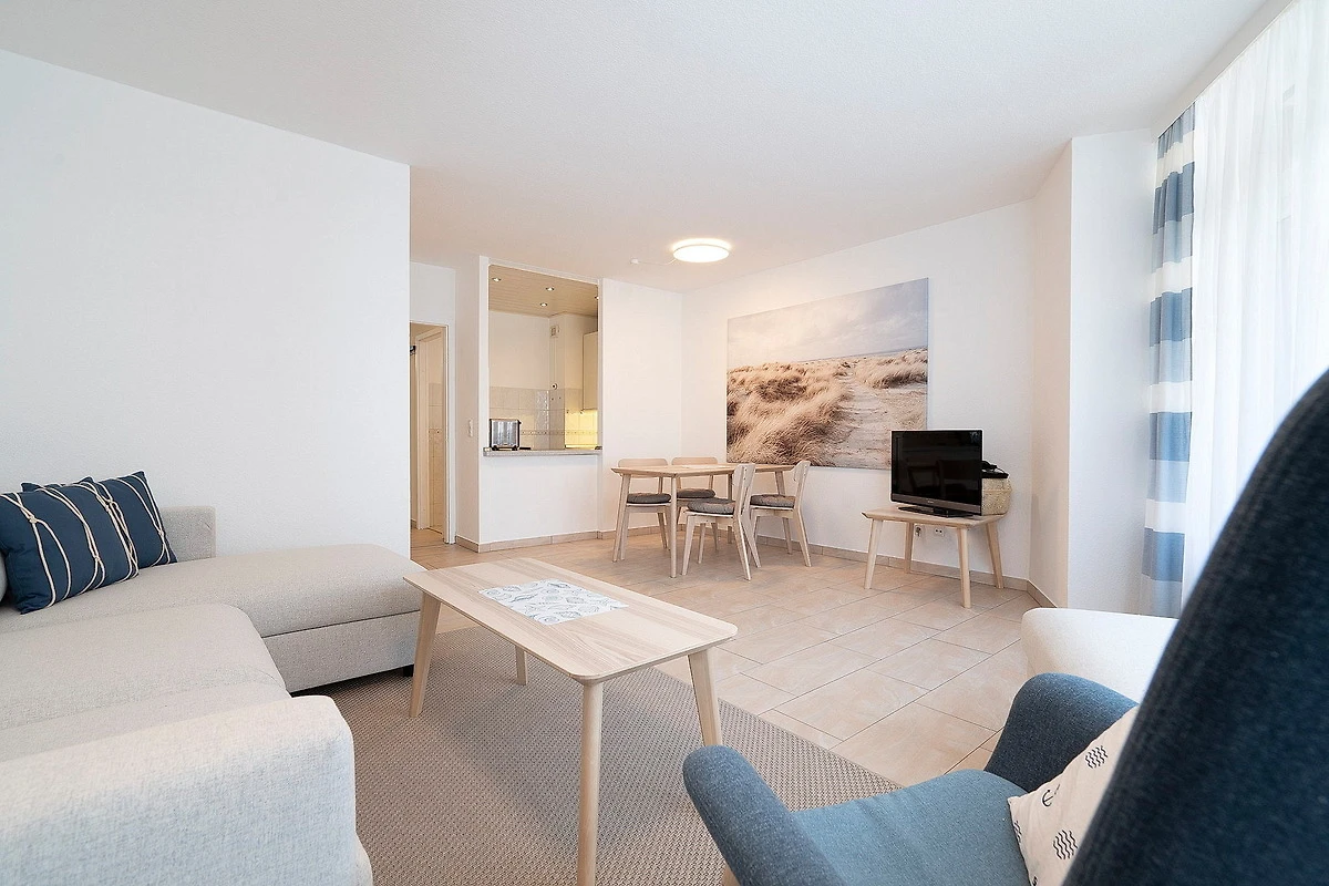 Geräumiges gefliestes Wohn- und Esszimmer mit direktem Zugang zum grossen Balkon. Das Wohn- und Esszimmer ist mit einer bequemen Eckcouch und Sessel, einem Couchtisch, einer Kommode und einem Essplatz für 4 Personen ausgestattet. Ein Fernseher mit DVD-Player und eine Mini-Stereoanlage stehen zur Unterhaltung bereit.