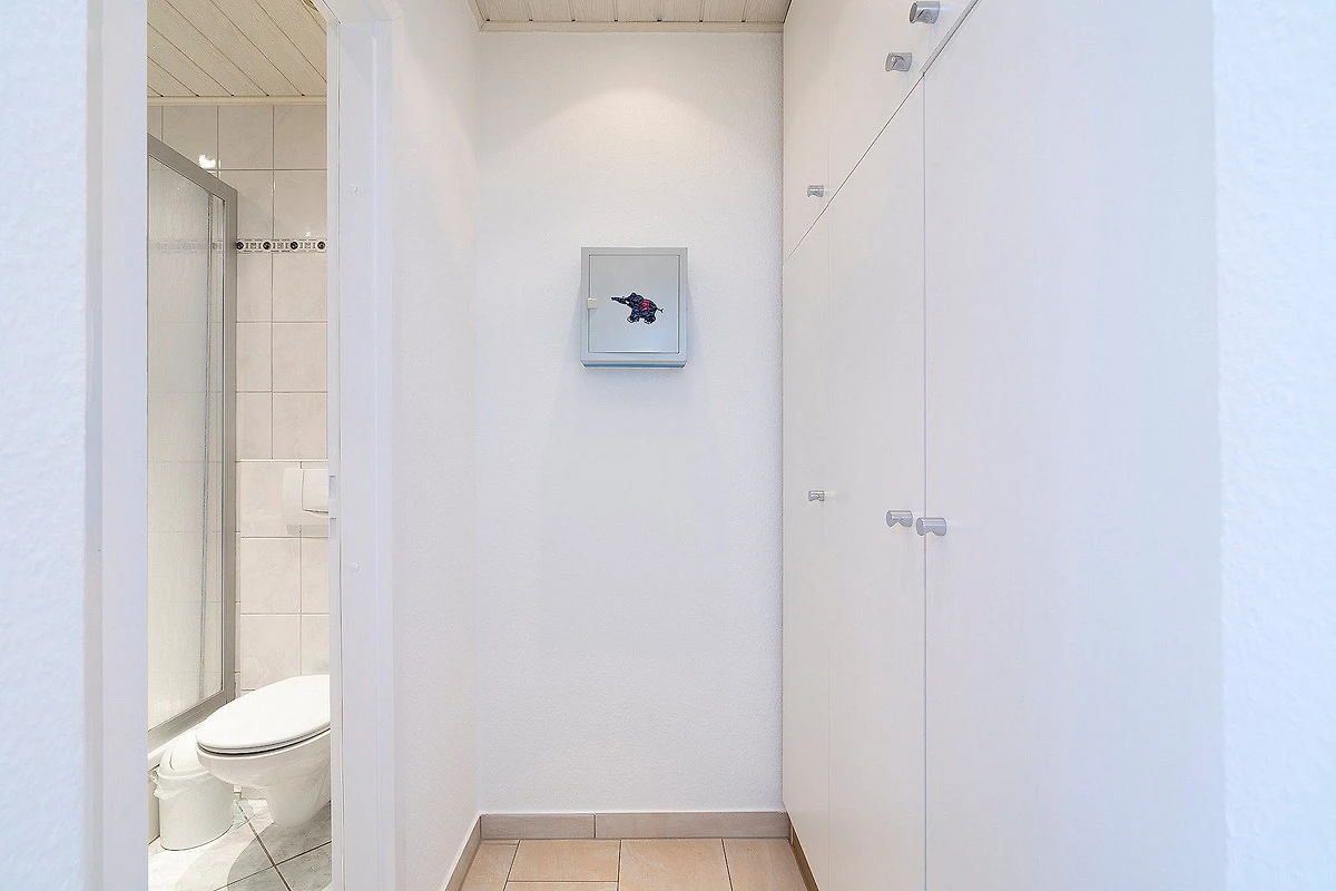 Gefliestes Schlafzimmer mit Fenster zum Laubengang. Das Fenster lässt sich durch einen Aussenrollladen vollständig verdunkeln Das Schlafzimmer ist mit 2 getrennten Betten (90x200cm) und einem 2-türigen Kleiderschrank ausgestattet. Ein weiterer Kleiderschrank befindet sich im Flur vor dem Bad.