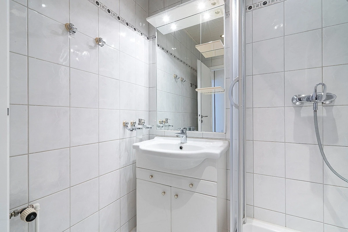 Helles, freundliches gefliestes Badezimmer mit Dusche, Toilette und Waschbecken.