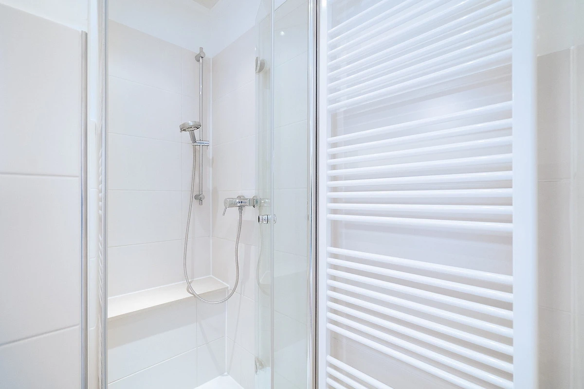 Freundliches, modernes und helles Tageslichtbad mit Dusche, WC und Waschbecken.