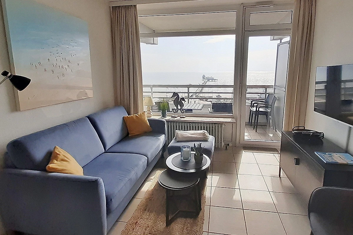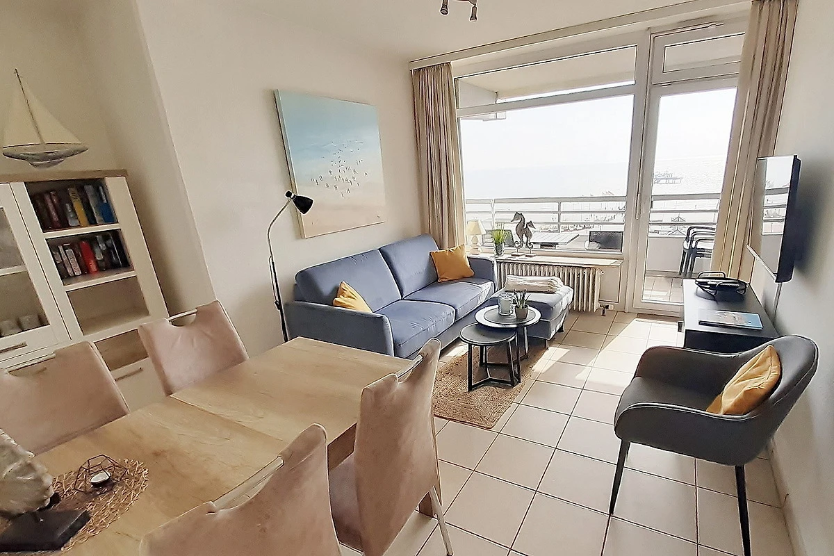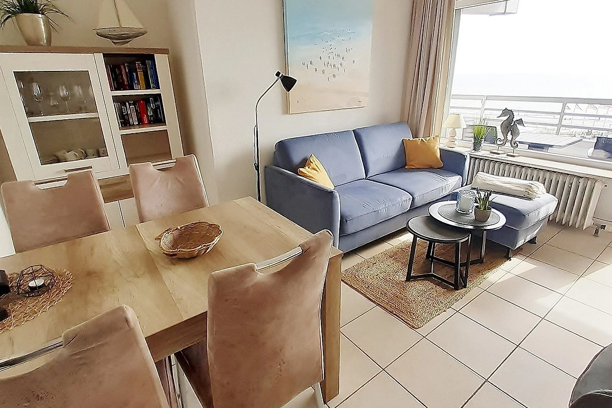 Modern ausgestattetes Wohn- und Esszimmer mit direktem Zugang zum Balkon und mit schönem Ausblick auf das Meer. Das Zimmer ist hell gefliest und mit einem Essplatz für 4 Personen, einer Eckcouch, einem Sessel und einer Kommode ausgestattet. Zur Unterhaltung steht ein Flachbild-TV zur Verfügung.