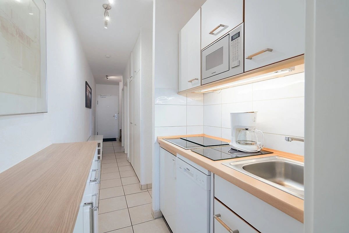 Die moderne, komplett eingerichtete Küchenzeile verfügt über einen 4 Platten-Cerankochherd, einen Kühlschrank, einer Mikrowelle, einen Geschirrspüler sowie einem Toaster, Wasserkocher und Kaffeemaschine.