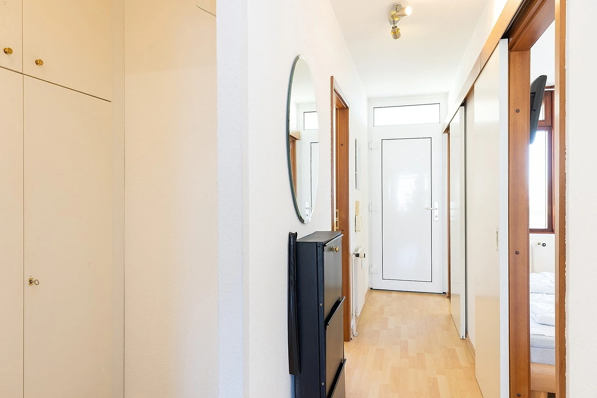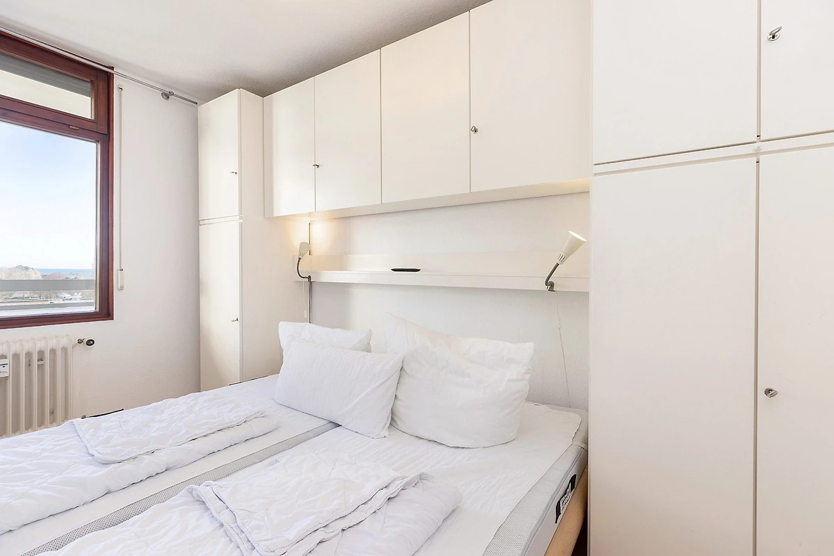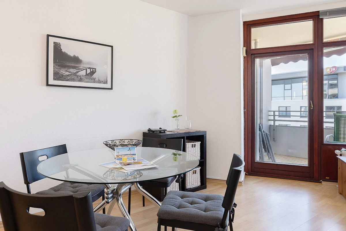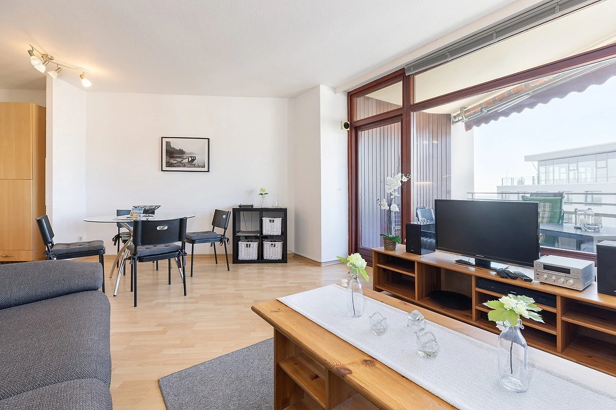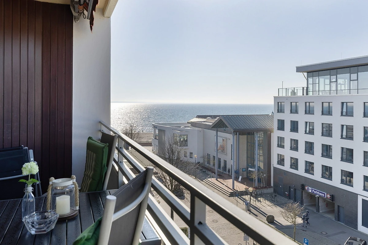 Balkon (mit Markise) in westliche Richtung mit Blick auf das Meer, Tiefgaragen-Stellplatz neben dem Eingang (max. 1,90m Höhe), Wäschetrockner und Waschmaschine gegen Gebühr im Haus. Kostenloses W-Lan.