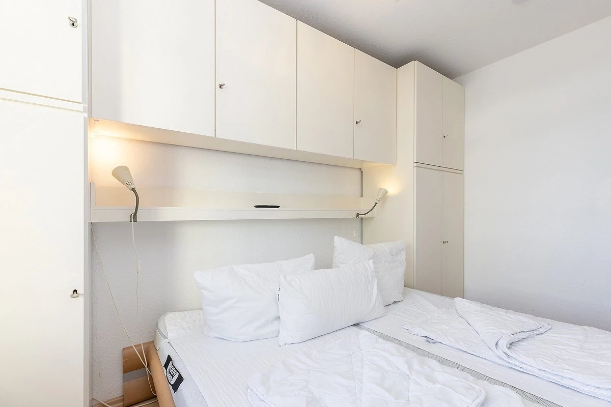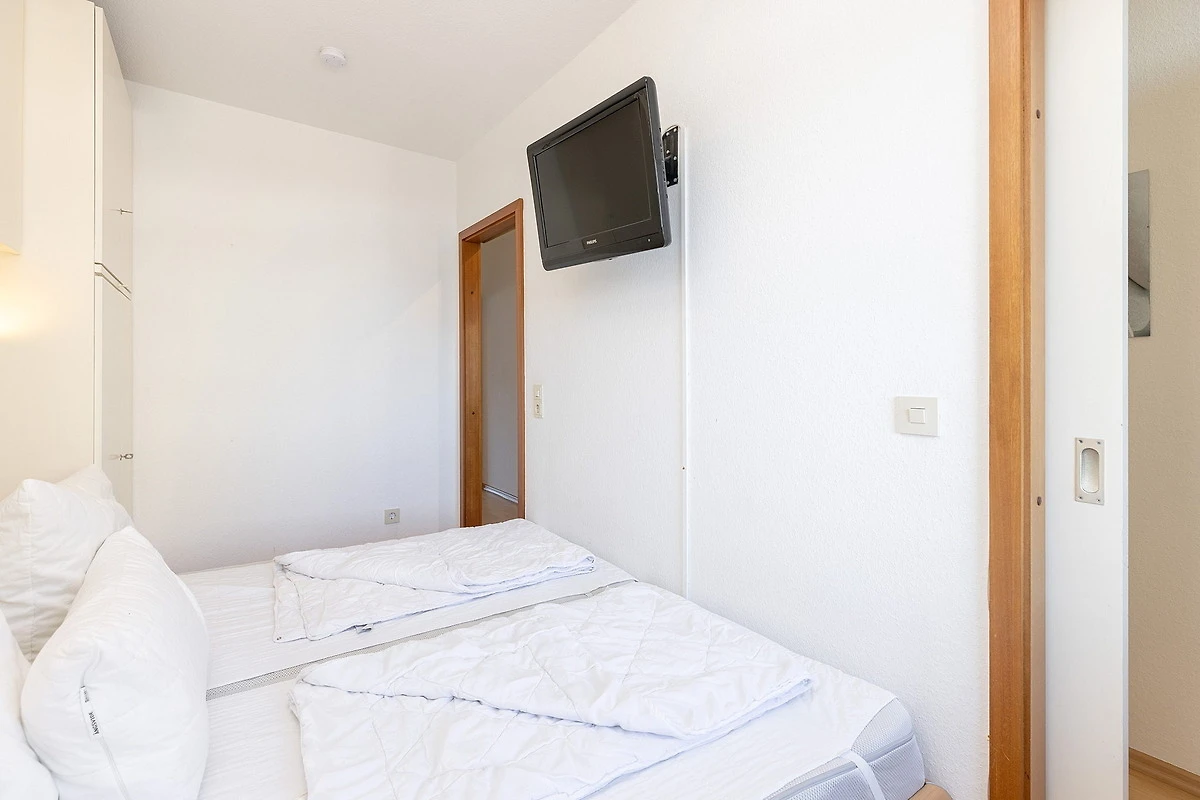 Kleines Schlafzimmer mit Fenster zum Laubengang (Rollo). Ausgestattet mit einem Doppelbett (2x90x200cm), je 1 Kleiderschrank auf beiden Seiten, Laminatfussboden, Fernseher.
