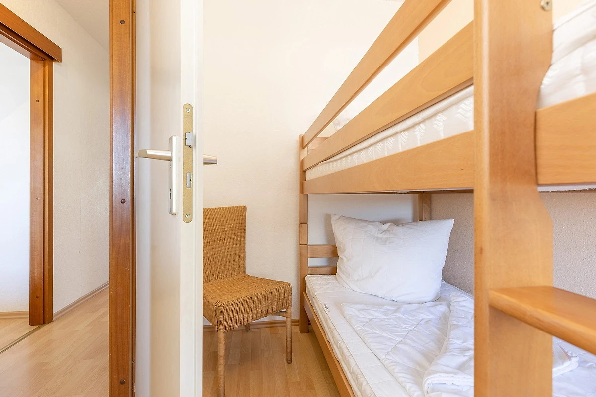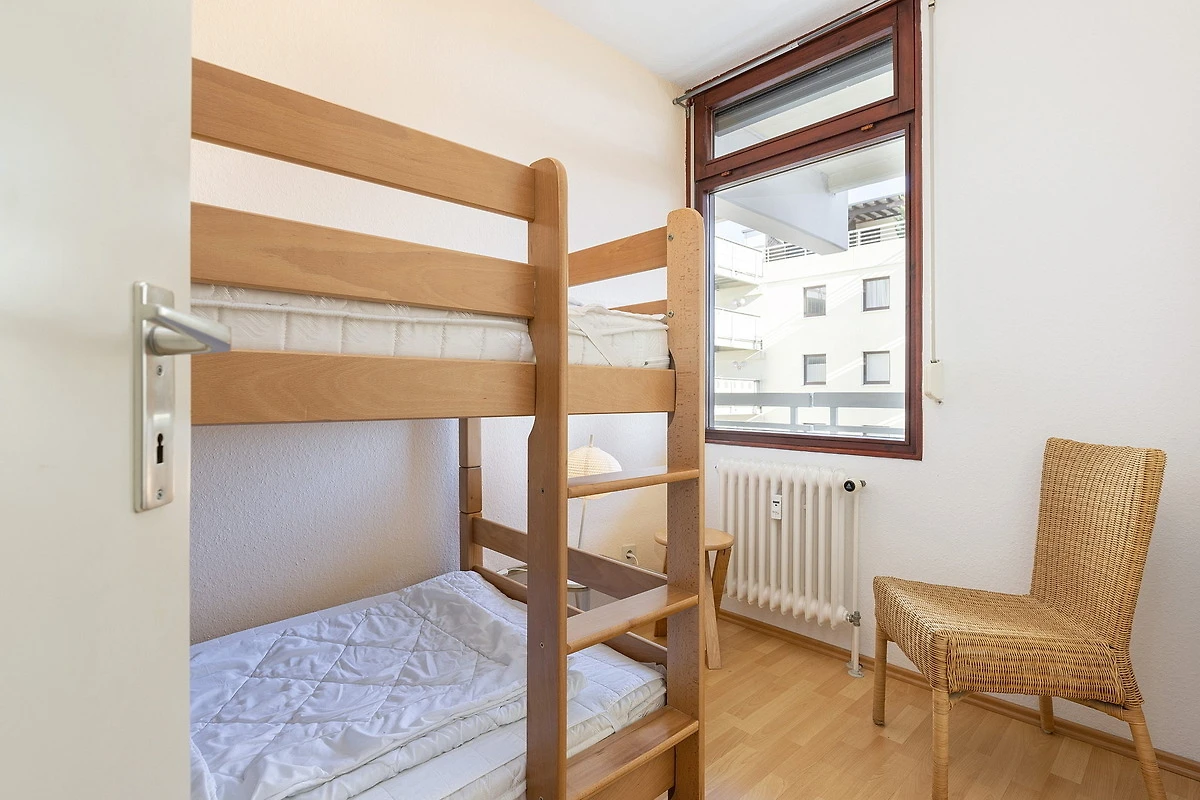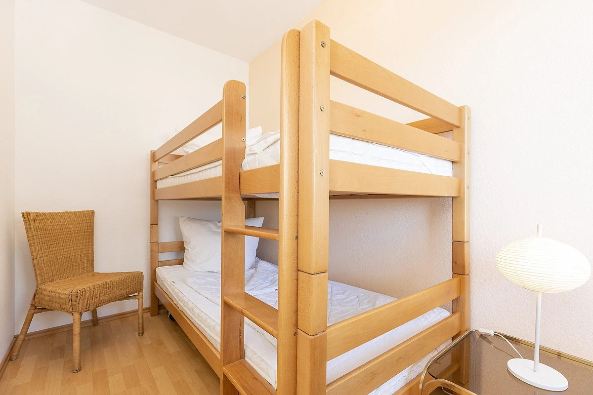 Kleines Kinderzimmer mit Fenster zum Laubengang (Rollo). Ausgestattet mit einem Etagenbett (90 x 200cm). Laminatfussboden.