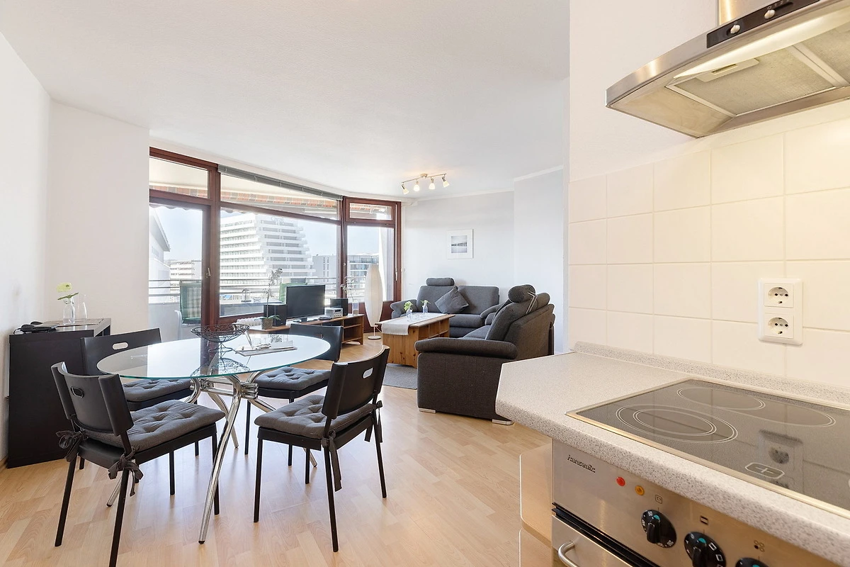 Zum Wohnzimmer offene, moderne, komplett ausgestattet Küche mit Ceran-Kochfeld (4 Flammen), Backofen, Spülmaschine, Kühlschrank, Toaster, Wasserkocher, Kaffeemaschine.