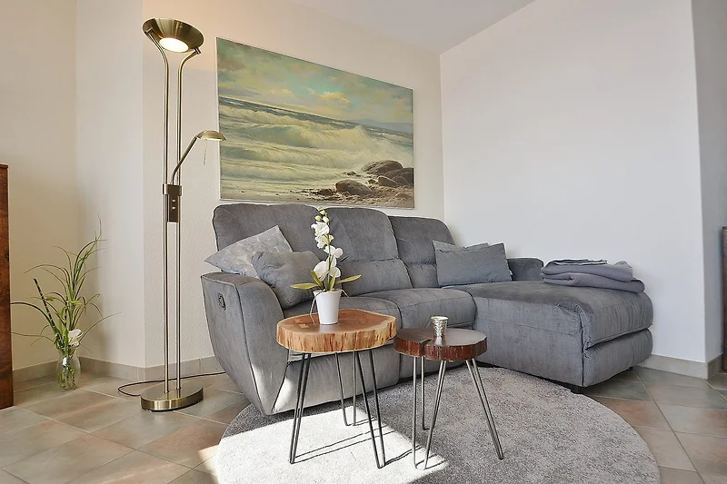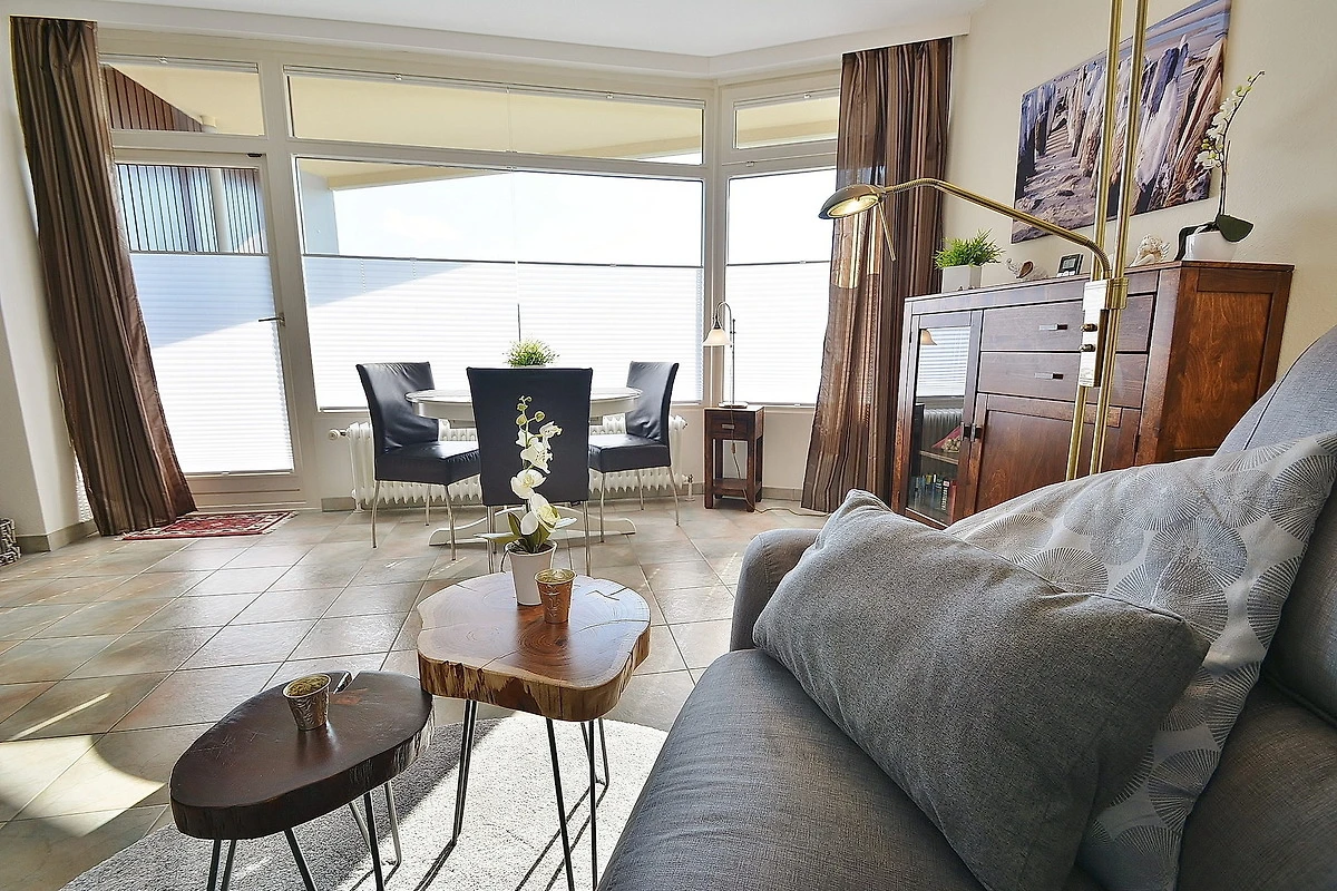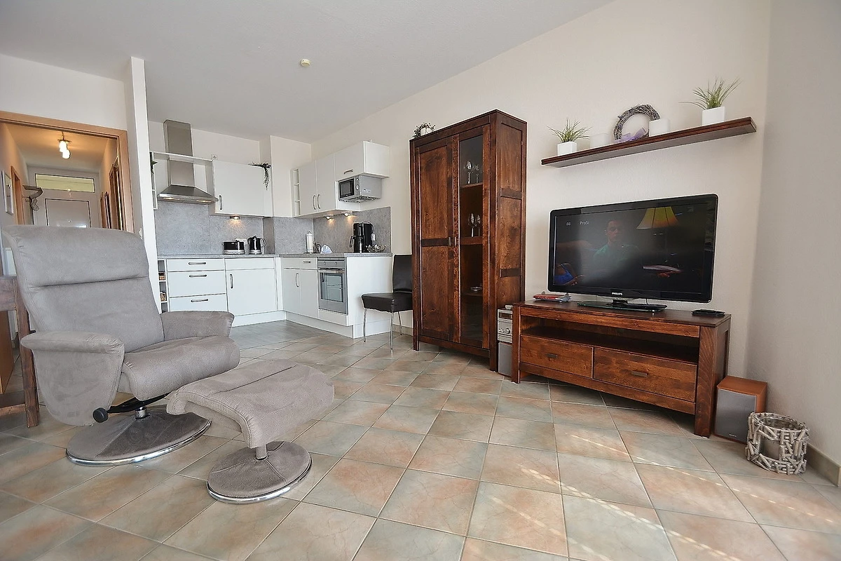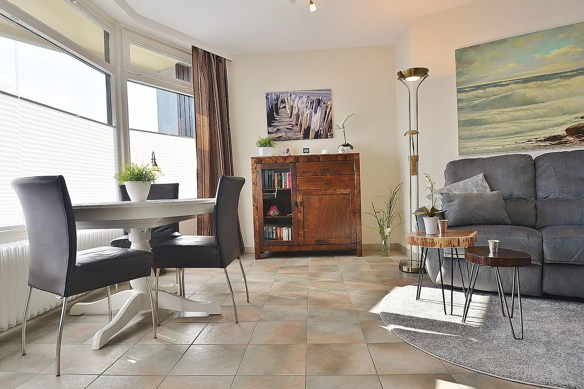 Modernes, freundliches Wohn- und Esszimmer mit direktem Zugang zum Balkon in westliche Richtung mit Seeblick. Das Wohn- und Esszimmer ist mit einem Essplatz für 4 Personen, einer Couch mit verstellbaren Fussstützen und einem Stressless-Sessel, einem Couchtisch und 2 Kommoden ausgestattet. Zur Unterhaltung stehen ein Flachbildfernseher und ein Radio mit CD-Player zur Verfügung. Das Wohnzimmer ist gefliest.