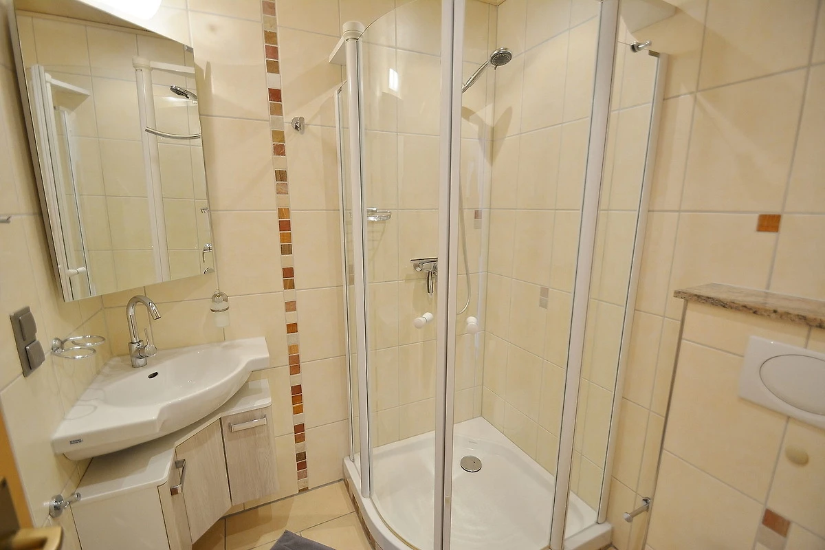 Modernes, hell gefliestes, freundliches Bad mit Dusche, WC und Waschbecken.