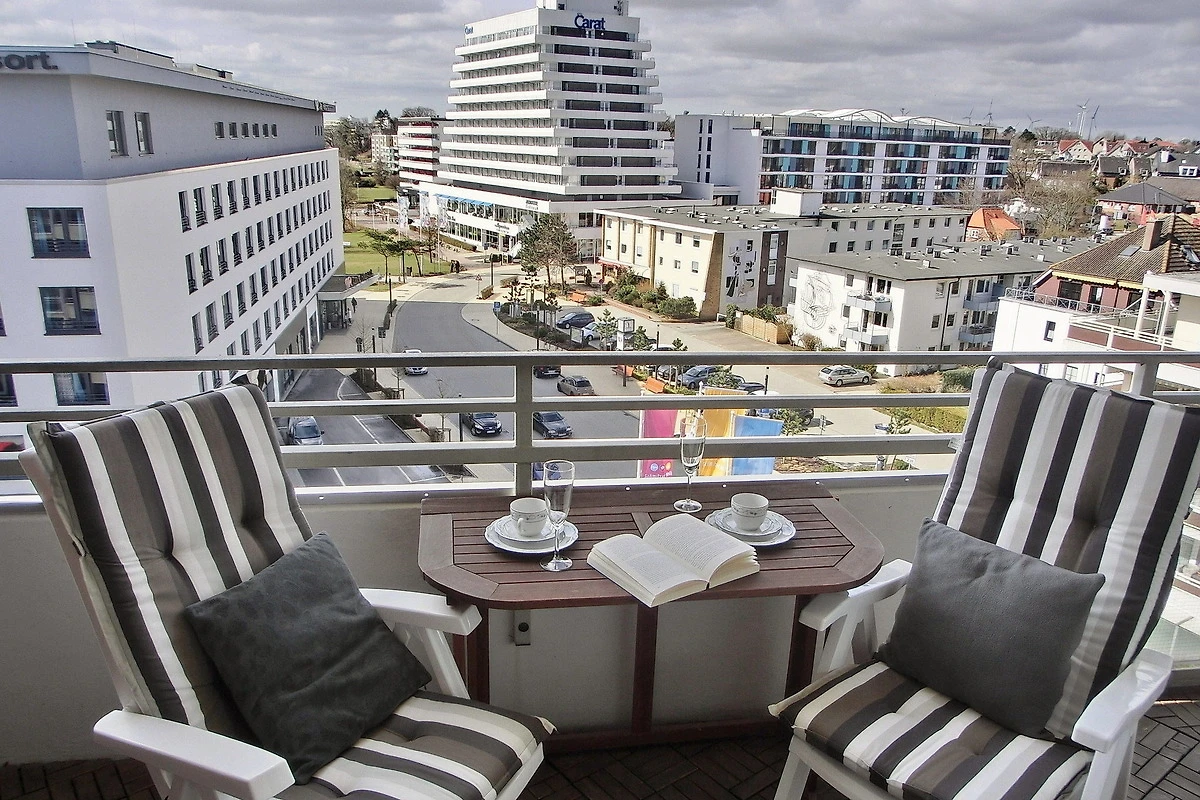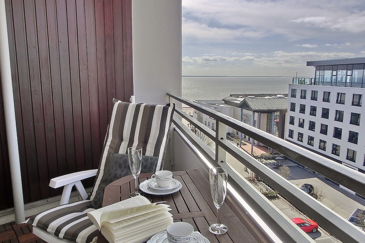 Balkon in westliche Richtung mit Blick auf das Meer, Tiefgaragen-Stellplatz (max. 1,90m Höhe), Wäschetrockner und Waschmaschine gegen Gebühr im Haus.