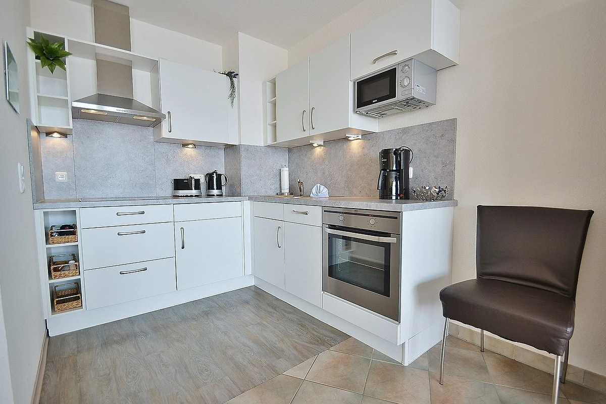 Moderne, zum Wohn- und Esszimmer offene, komplett eingerichtete Küche. Die Küche verfügt über ein 4-Platten Cerankochfeld, einen Backofen, eine Spülmaschine, einen Kühlschrank mit kleinem 3-Sterne Gefrierfach, eine Mikrowelle, eine Kaffeemaschine, einen Toaster und einen Wasserkocher.