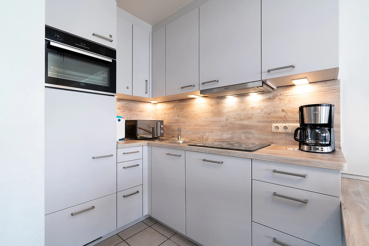 Moderne, neue, komplett eingerichtete, zum Wohnbereich offene Küche mit einem 4-Platten Cerankochfeld, einer Spülmaschine, Backofen, Kühlschrank mit kleinem 3-Sterne Gefrierfach, Mikrowelle, Kaffeemaschine, Toaster und Wasserkocher.