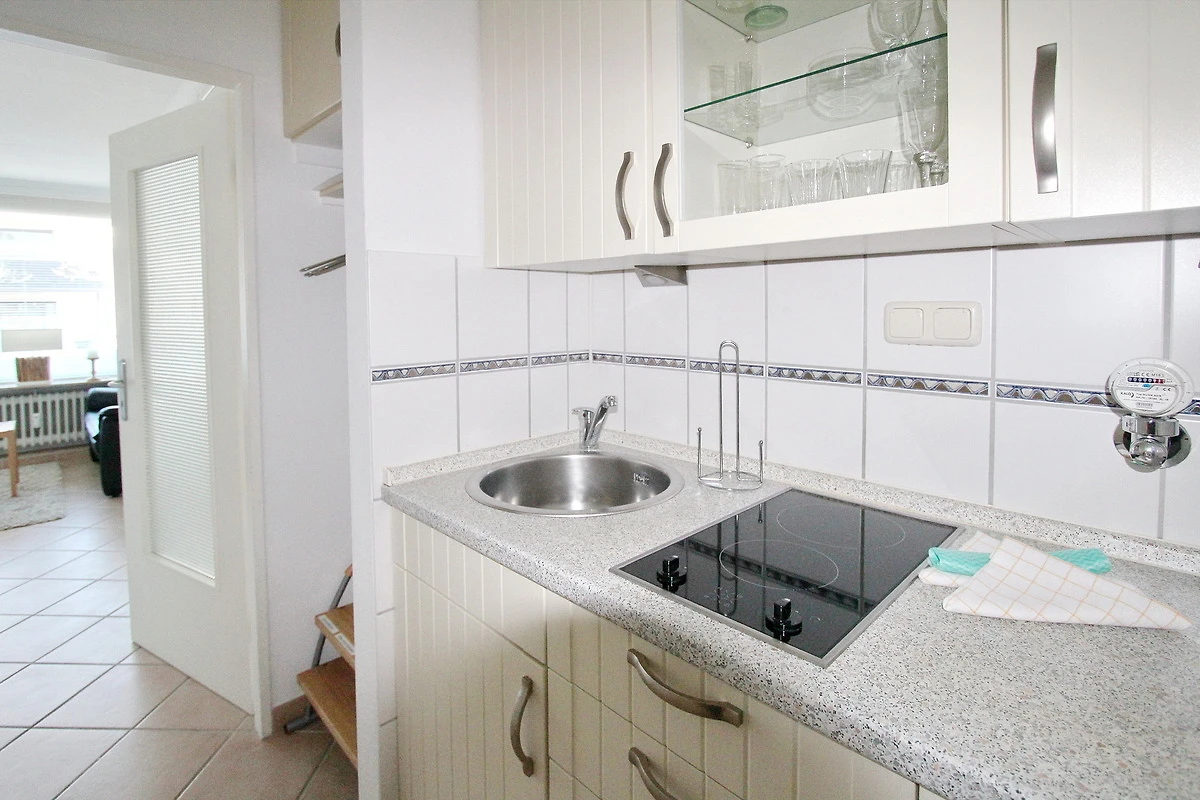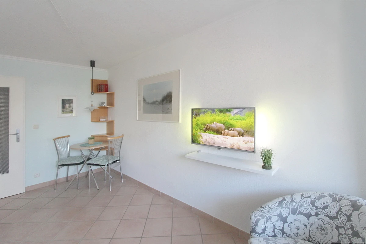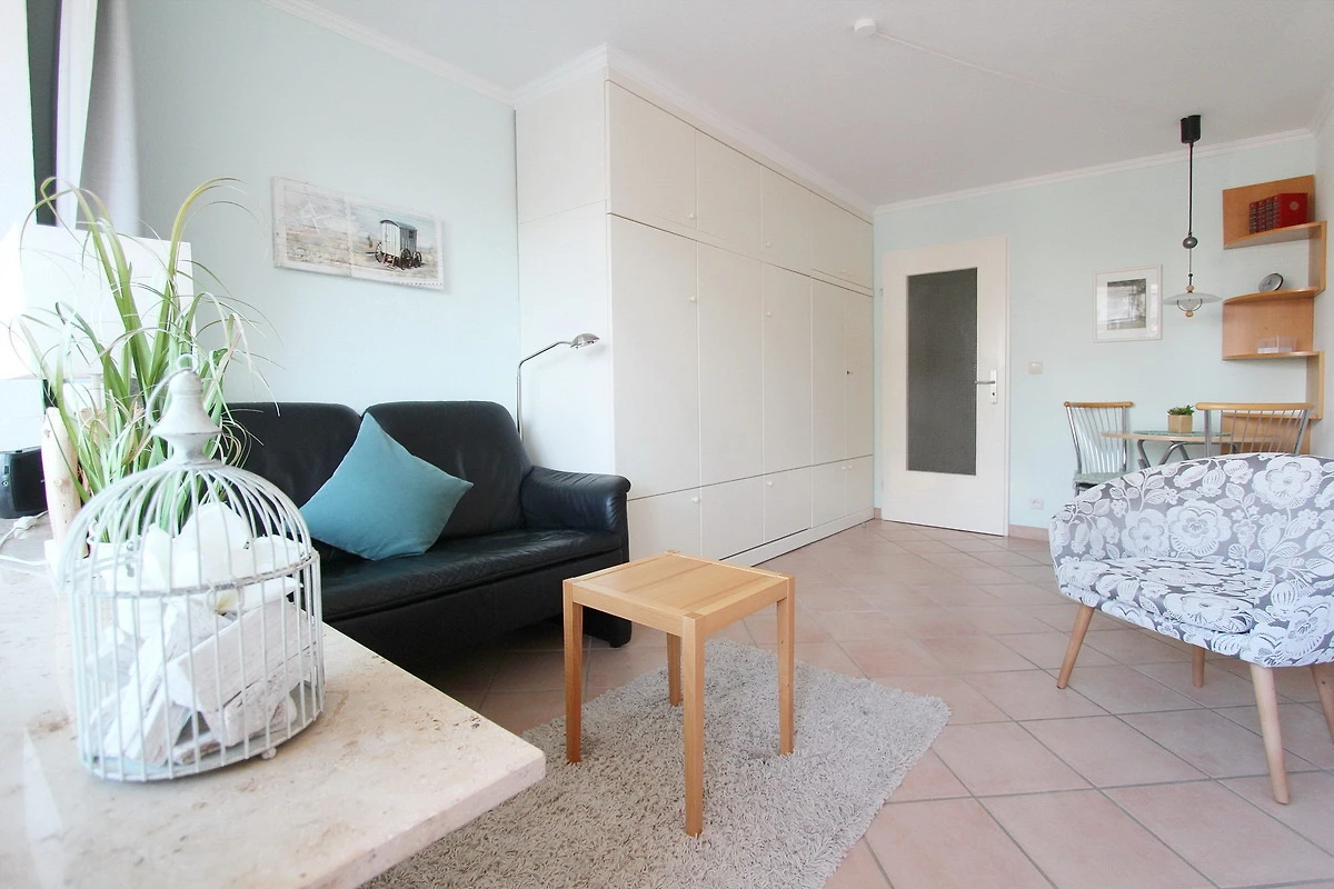Im Holsteinischen Haus im Obererdgeschoss befindet sich diese hübsche Einzimmerwohnung im Innenstadtbereich von Westerland. In wenigen Minuten sind sie in der Fussgängerzone und an der Promenade, der Bäcker ist gleich um die Ecke. Der hell und freundlich eingerichtete Wohn-/Schlafraum verfügt über ein Doppelschrankbett, einen Essplatz mit 2 Stühlen, sowie eine Ledercouch mit Sessel. Der Balkon zur Westseite verfügt über Balkonmöbel und Auflagen. In der Wohnung wurde hochwertiger Fliesenboden verlegt. Um sich selbst zu verpflegen gibt es im Flur eine Einbauküche mit 2 Platten Ceranfeld. Das Badezimmer hat eine Dusche. Zur technischen Ausstattung dieser Nichtraucherwohnung gehört: ein Flachbildfernseher und ein Radio. Wohnungsgrösse: ca. 25 m². Ein Pkw-Stellplatz ist inklusive und steht Ihnen in der Tiefgarage mit Doppelparksystem zur Verfügung. Die ausgehängten Betriebsanleitungen für die Nutzung der Garagen sind Bestandteil des Mietvertrages (nicht für alle PKWs geeignet).