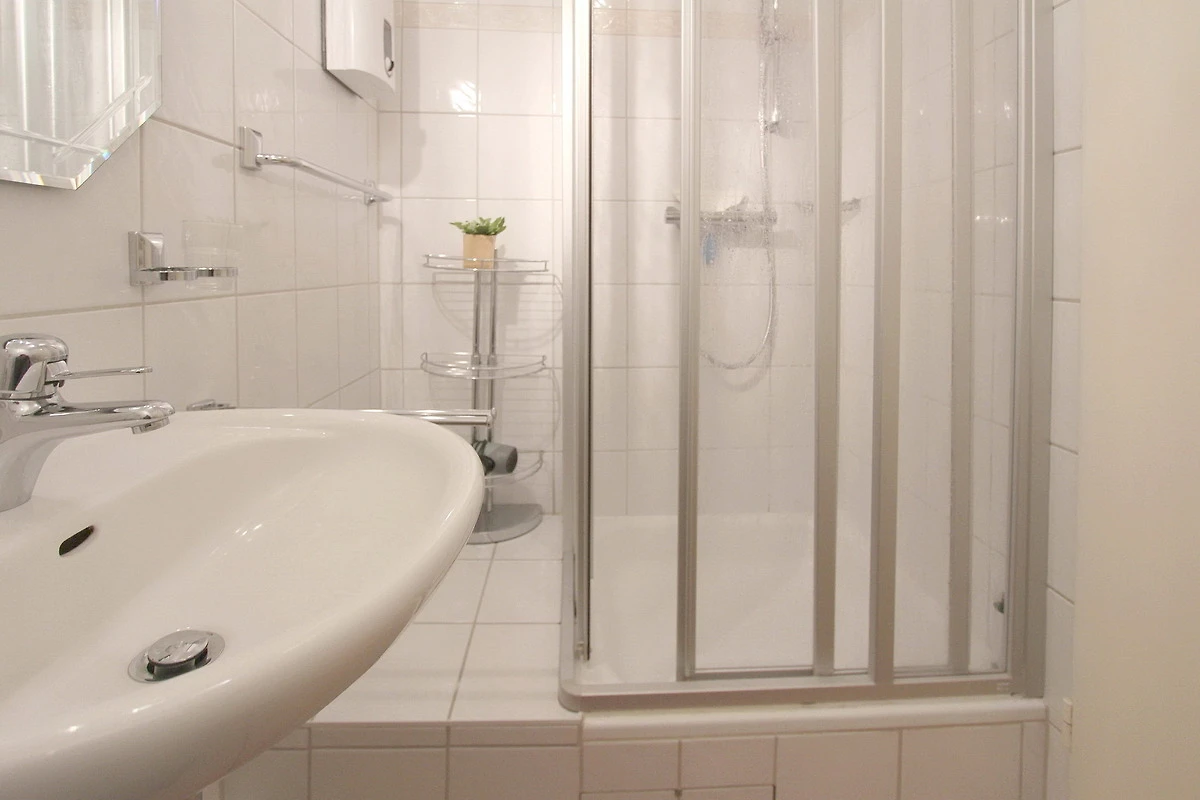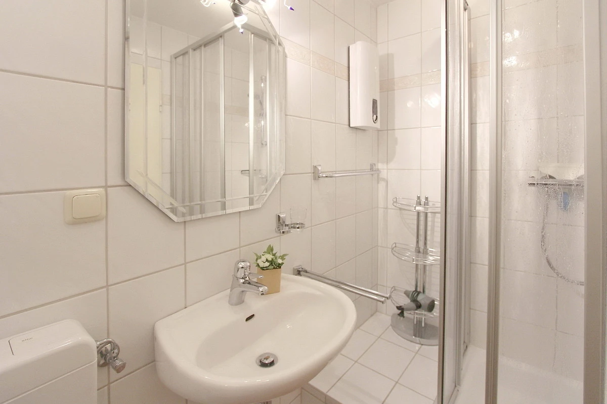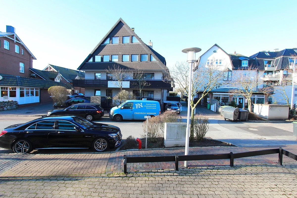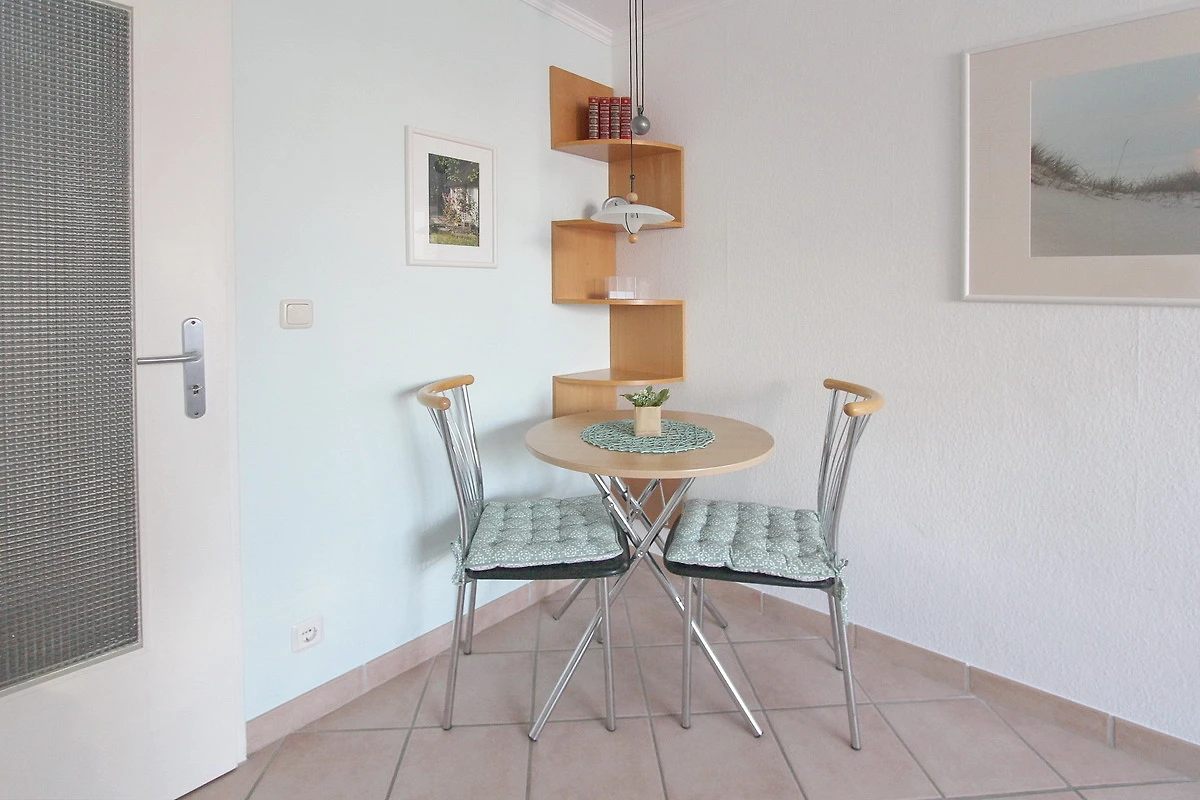 Im Holsteinischen Haus im Obererdgeschoss befindet sich diese hübsche Einzimmerwohnung im Innenstadtbereich von Westerland. In wenigen Minuten sind sie in der Fussgängerzone und an der Promenade, der Bäcker ist gleich um die Ecke. Der hell und freundlich eingerichtete Wohn-/Schlafraum verfügt über ein Doppelschrankbett, einen Essplatz mit 2 Stühlen, sowie eine Ledercouch mit Sessel. Der Balkon zur Westseite verfügt über Balkonmöbel und Auflagen. In der Wohnung wurde hochwertiger Fliesenboden verlegt. Um sich selbst zu verpflegen gibt es im Flur eine Einbauküche mit 2 Platten Ceranfeld. Das Badezimmer hat eine Dusche. Zur technischen Ausstattung dieser Nichtraucherwohnung gehört: ein Flachbildfernseher und ein Radio. Wohnungsgrösse: ca. 25 m². Ein Pkw-Stellplatz ist inklusive und steht Ihnen in der Tiefgarage mit Doppelparksystem zur Verfügung. Die ausgehängten Betriebsanleitungen für die Nutzung der Garagen sind Bestandteil des Mietvertrages (nicht für alle PKWs geeignet).