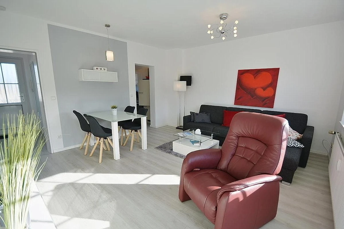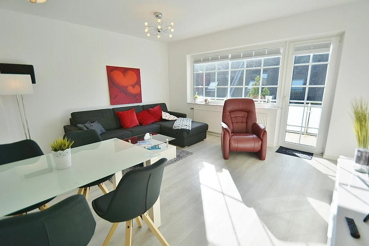 Das helle moderne Wohn- und Esszimmer mit direktem Zugang zum Balkon ist mit einer gemütliche Eckcouch mit Schlaffunktion (150x200cm mit Lattenrost), einem Relax-Sessel sowie einem Essplatz für 4 Personen ausgestattet. Zur Unterhaltung steht ein Flachbildfernseher zur Verfügung. Das Wohnzimmer ist mit Designer-Planken ausgelegt und lässt sich durch ein Rollo verdunkeln.