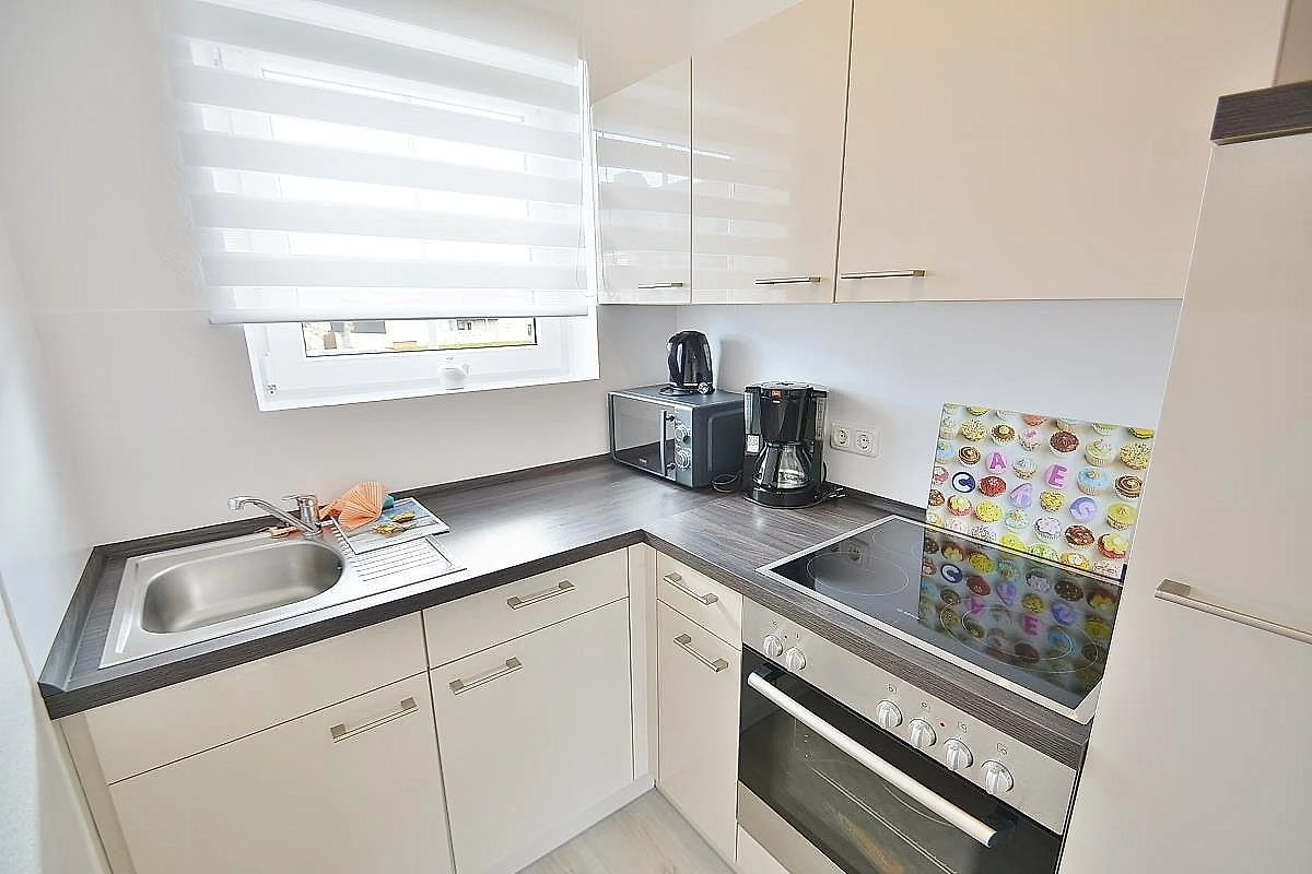 Die separate Küche verfügt über ein 4-Platten Cerankochfeld, einen Backofen sowie einen Kühlschrank mit kleinem 3 Sterne Gefrierfach. Des Weiteren ist sie mit einem Wasserkocher und einem Toaster ausgestattet.