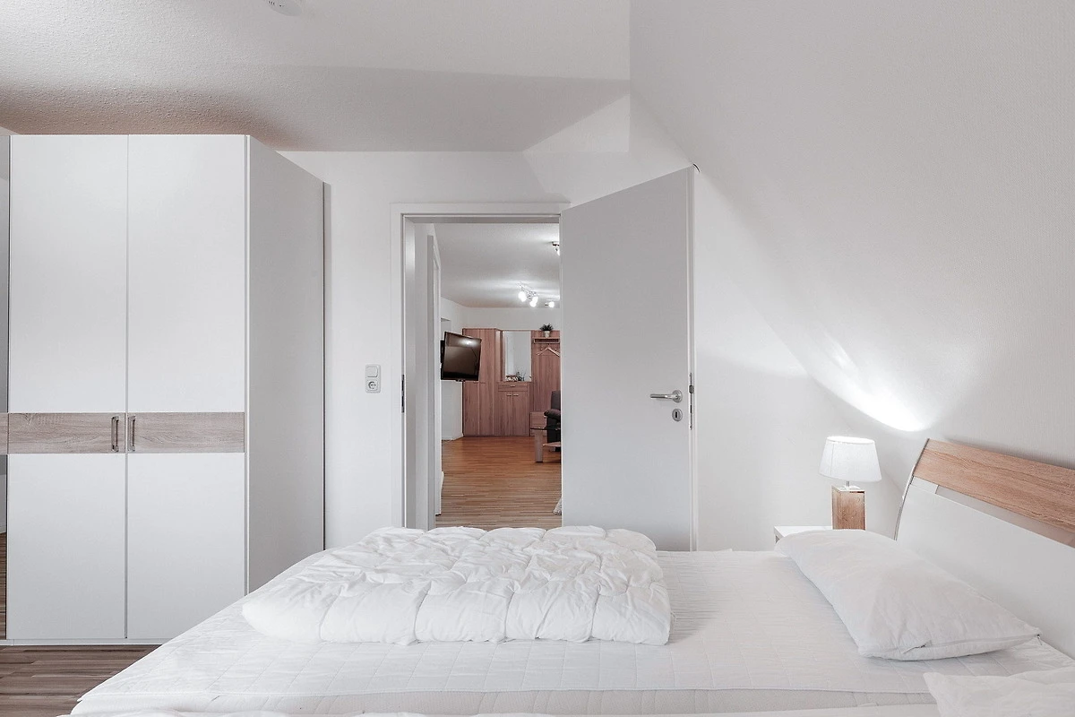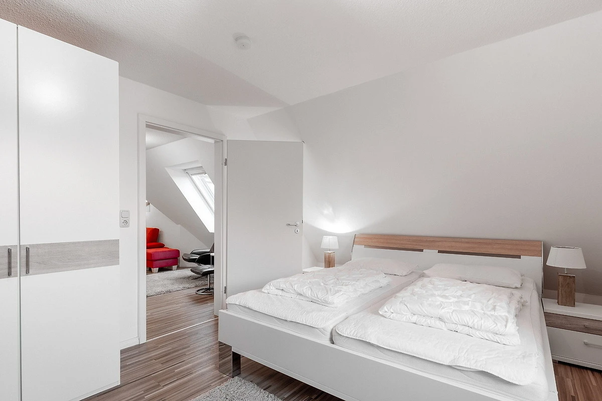 Separates, modern ausgestattetes Schlafzimmer in nördliche Richtung. Das Schlafzimmer ist mit einem Doppelbett (2x 90x200cm mit verstellbaren Lattenrosten), 2 Nachttischen, einem Smart-TV Fernseher (Empfang über Internet) und einem 3-türigen Kleiderschrank ausgestattet. Das Schlafzimmer ist mit Designerplanken ausgelegt. Das Fenster lässt sich durch einen Vorhang und einen elektrischen Aussenrolladen blickdicht verdunkeln.