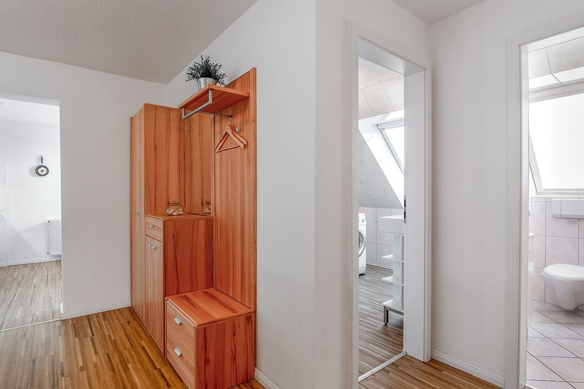 Modern ausgestattetes, helles Wohnzimmer mit einer Eck-Couch, die zur Schlaf-Couch (120x190cm) ausgezogen werden kann, einem Sessel, einem Couchtisch, einer Kommode und einem Garderobenschrank ausgestattet. Das Wohnzimmer ist mit Designerplanken ausgelegt. Zur Unterhaltung steht ein Smart-TV Fernseher (50 Zoll) sowie eine kleine HiFi-Anlage zur Verfügung.