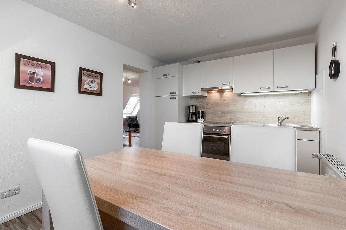 Moderne, komplett ausgestattete Wohnküche mit einem Essplatz für 4 Personen. Die Küche ist mit einem 4-Platten Cerankochfeld, einem Backofen, einer Spülmaschine, einem Kühlschrank mit kleinem 3-Sterne Gefrierfach, einem Toaster, einem Wasserkocher und einer Kaffeemaschine ausgestattet.