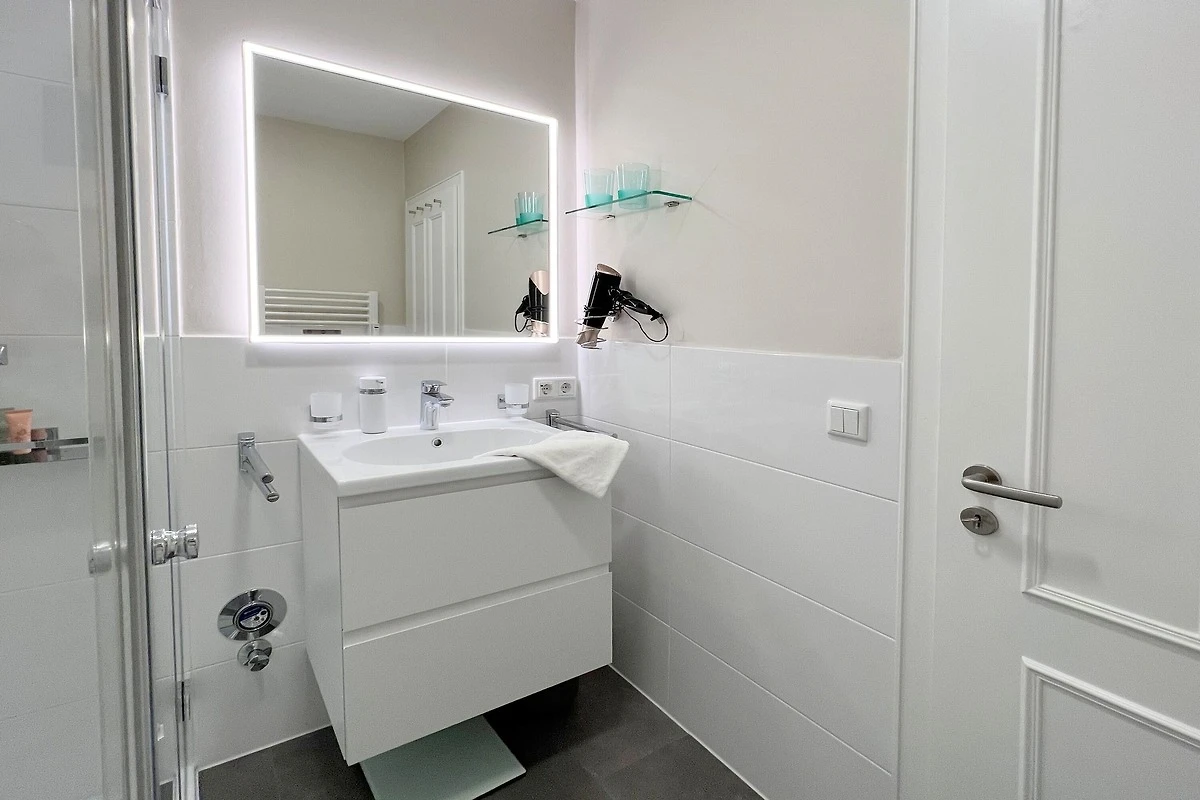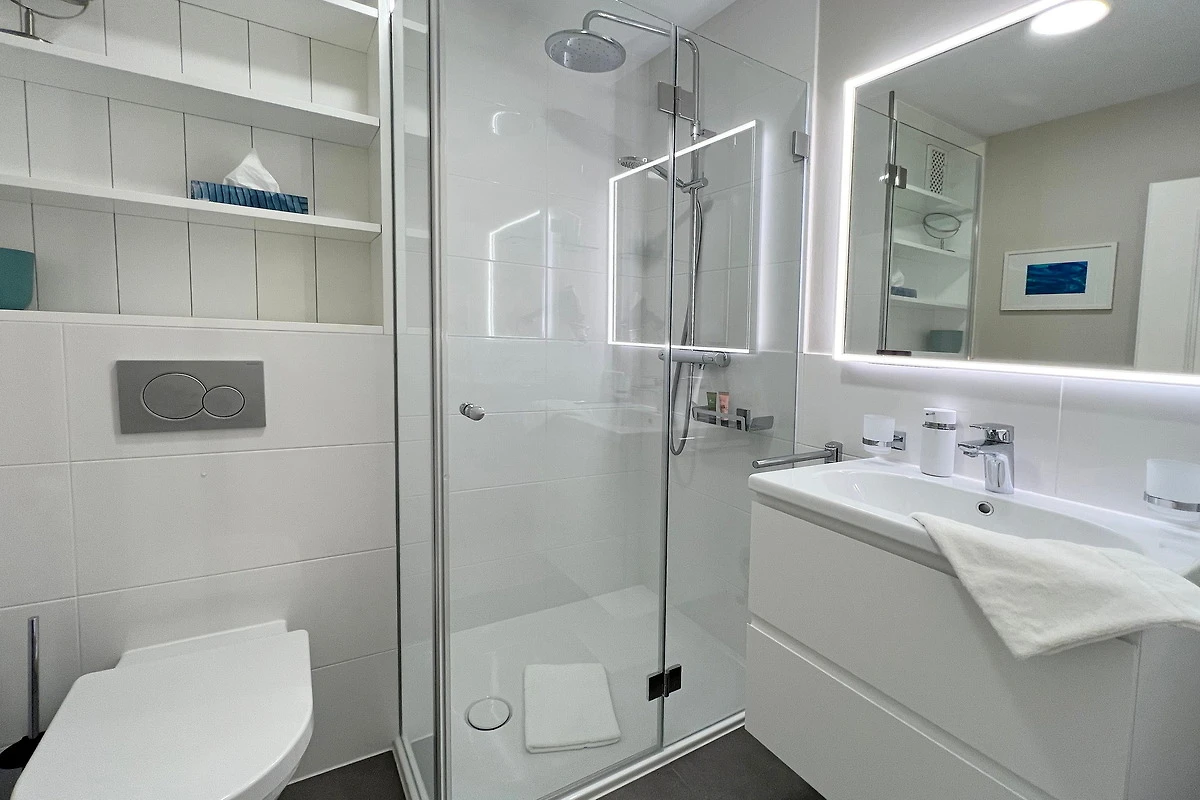 Das innen liegende Duschbad bietet eine grosszügige Dusche mit Regen- und Massagefunktionen und einem nahezu ebenerdigen Einstieg. Die Beleuchtung an Decke und Spiegel ist individuell adaptierbar. Handtuchtrockner, Föhn, Vergrösserungsspiegel und viel Stauraum in Regal und den Schubladen runden den Komfort ab.