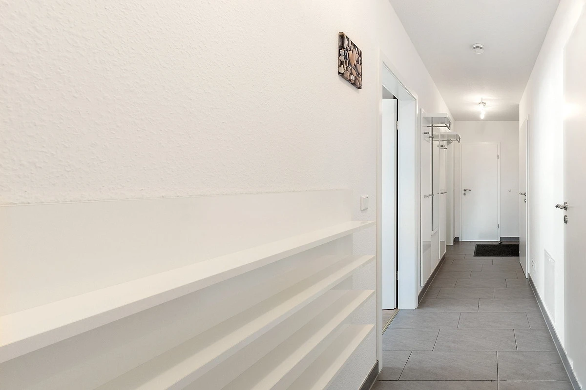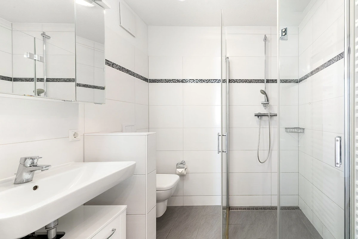 Modernes, gefliestes Bad mit Dusche, WC und Waschbecken. Im Bad und im separaten WC Fussbodenheizung.