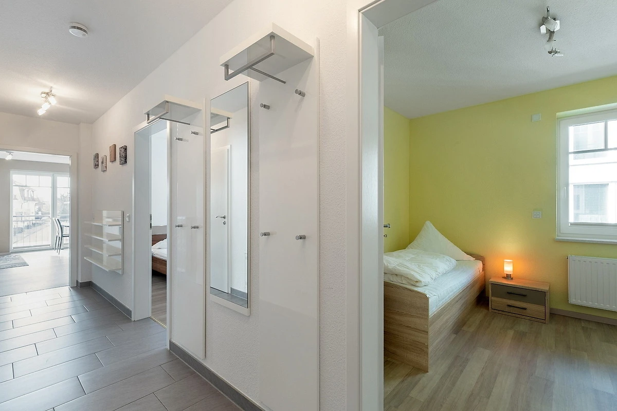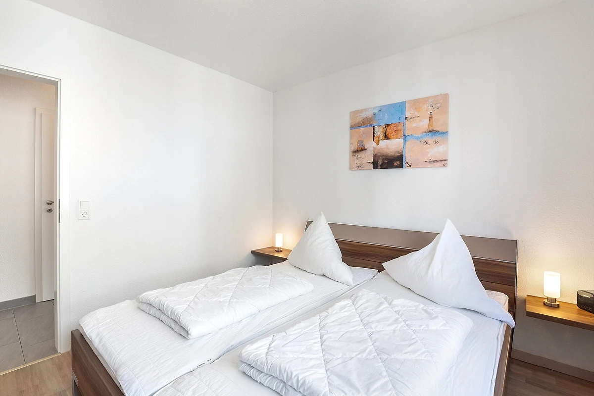 Separates, modern ausgestattetes Schlafzimmer mit einem Doppelbett (2x 90x200cm) und einem Kleiderschrank. Zur Unterhaltung steht ein Flachbildschirm zur Verfügung. Das Fenster lässt sich durch einen Aussenrollladen vollständig verdunkeln.