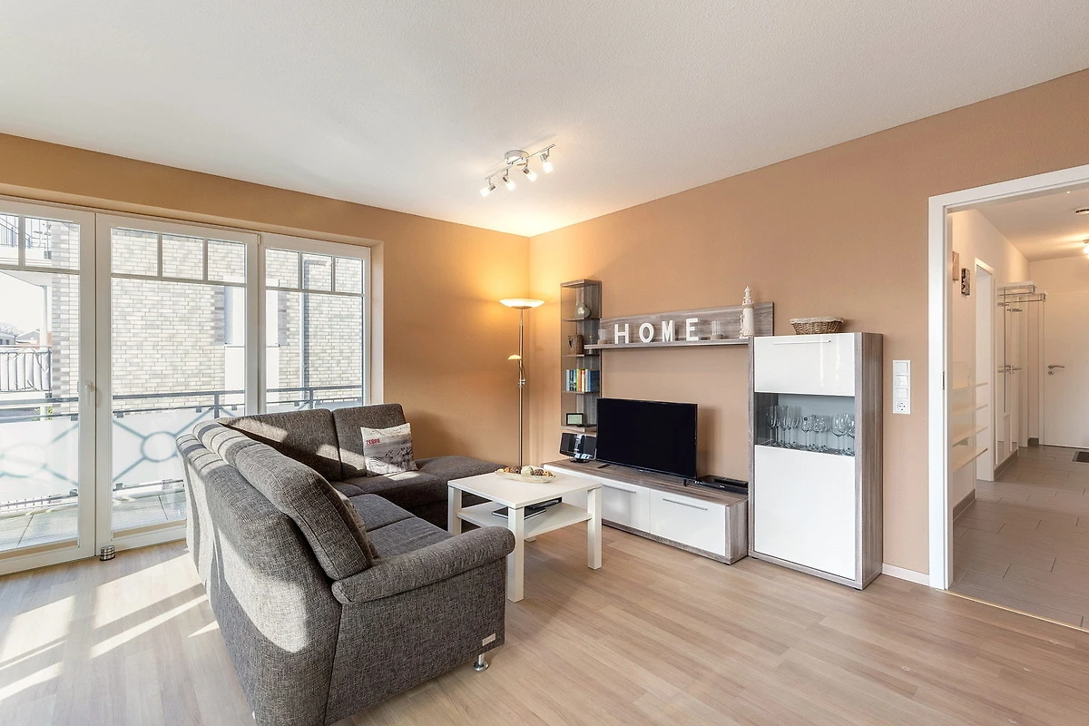 Modernes, helles Wohn- und Esszimmer mit direktem Zugang zum Balkon in westliche Richtung. Das Wohn- und Esszimmer ist mit einem Essplatz für 4 Personen, einer Eckcouch und einem Couchtisch ausgestattet. Zur Unterhaltung stehen ein Flachbildschirm, ein DVD-Player und eine Mini-Stereoanlage zur Verfügung.