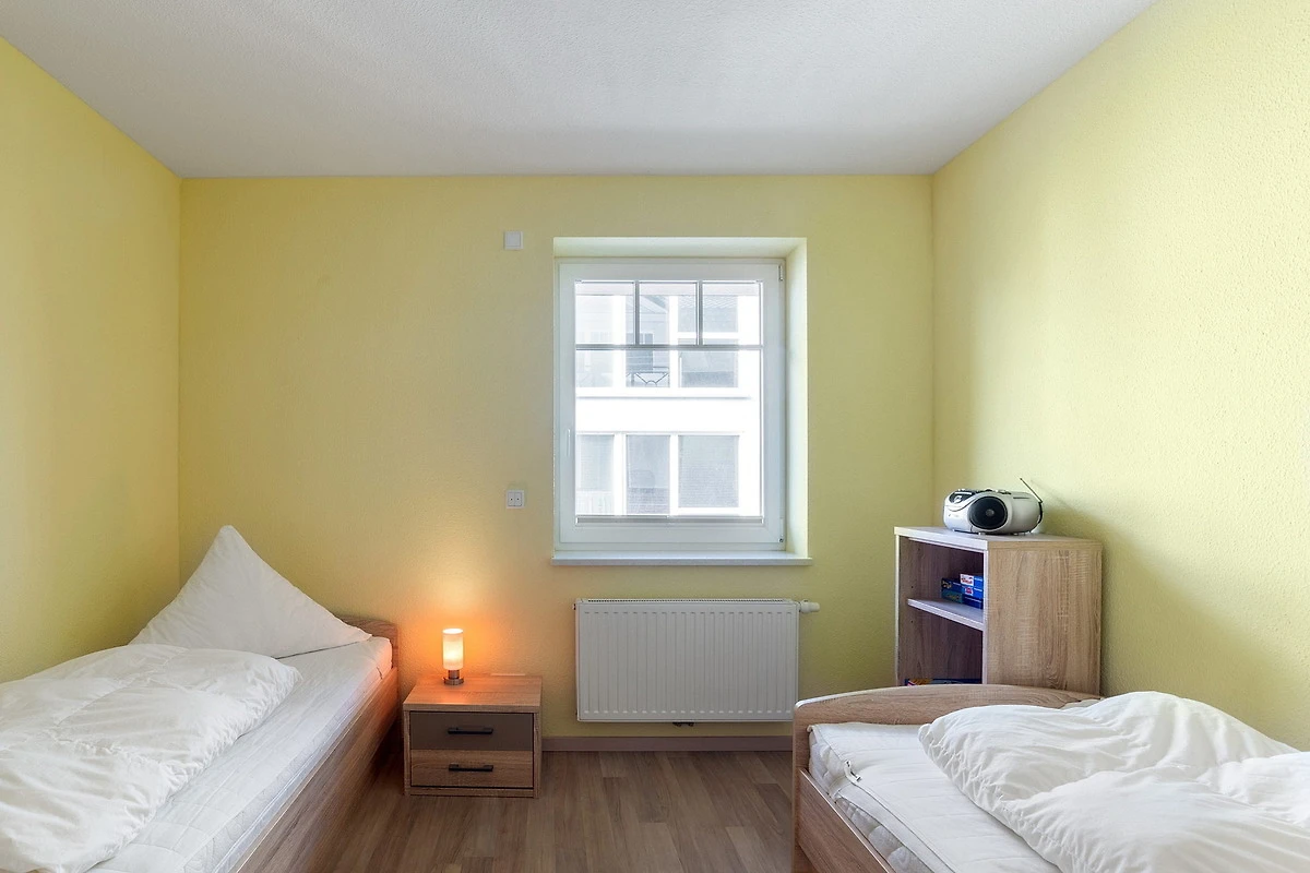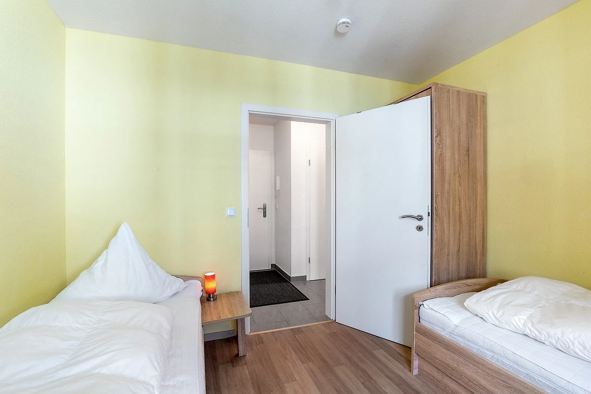 Separates, modern ausgestattetes Zimmer mit 2 Einzelbetten (90x200cm) und einem Kleiderschrank. Das Fenster lässt sich durch einen Aussenrollladen vollständig verdunkeln.