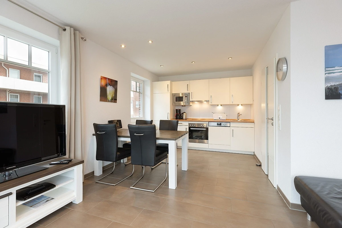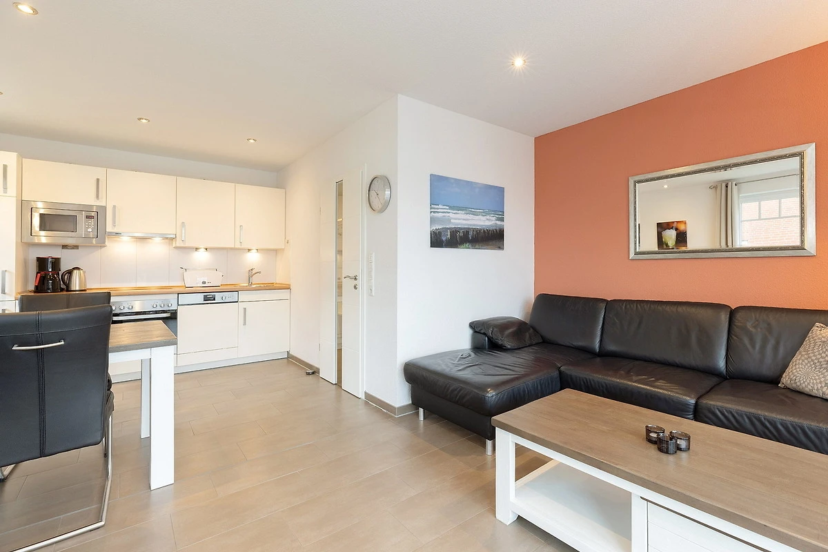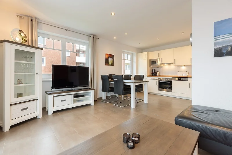 Moderne, zum Wohn- und Esszimmer offene Küchenzeile. Sie ist mit einem 4-Platten Cerankochfeld, einem Backofen, einem Kühlschrank mit kleinem 3-Sterne Gefrierfach, einer Spülmaschine, einem Toaster, Eierkocher, Wasserkocher, einer Mikrowelle und einer Kaffeemaschine ausgestattet.
