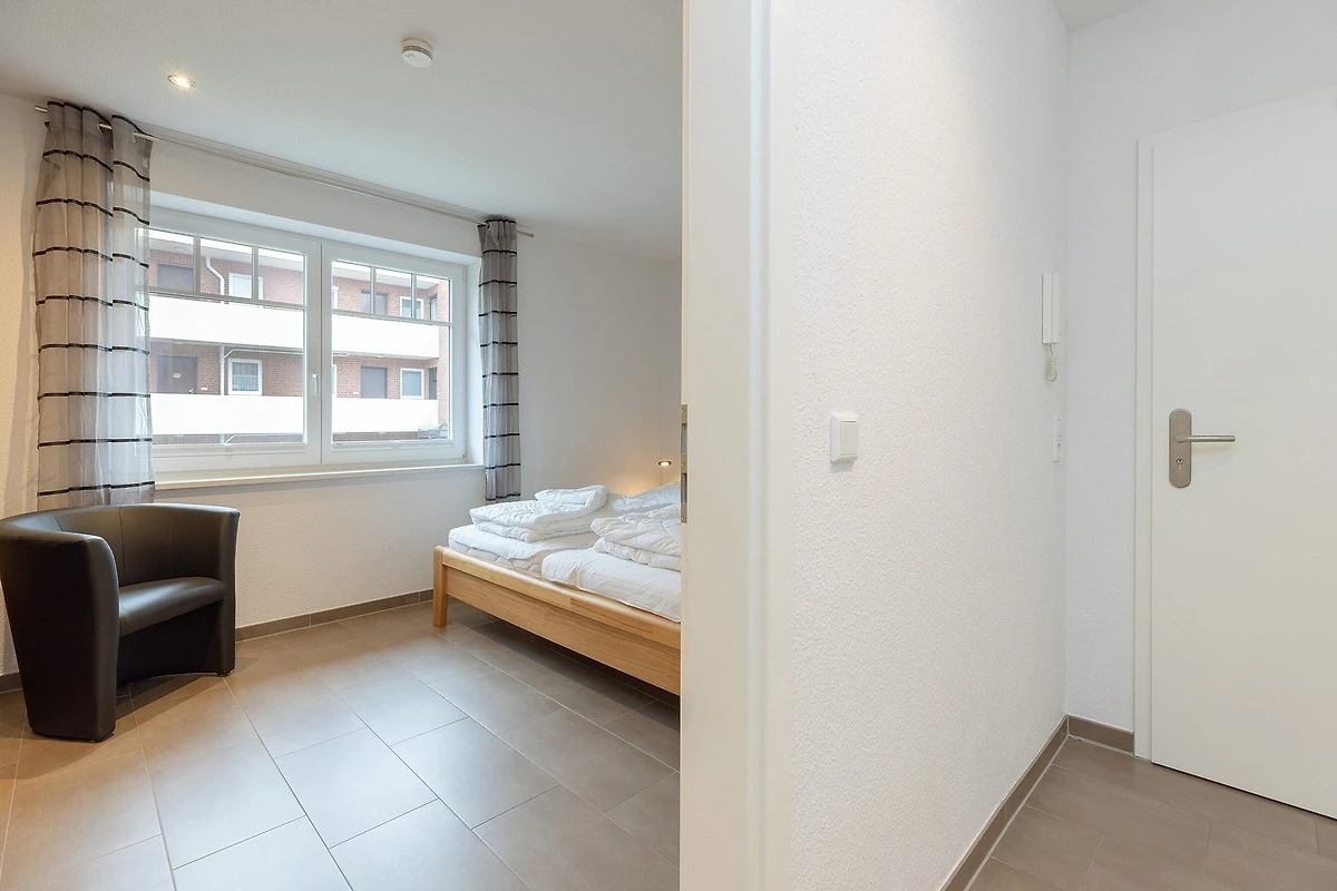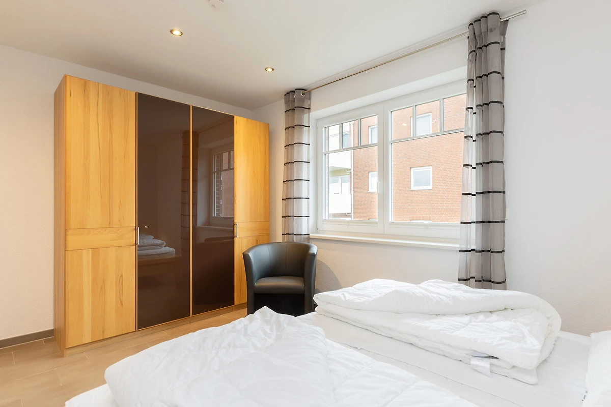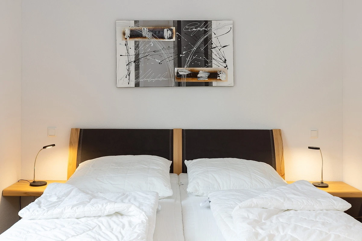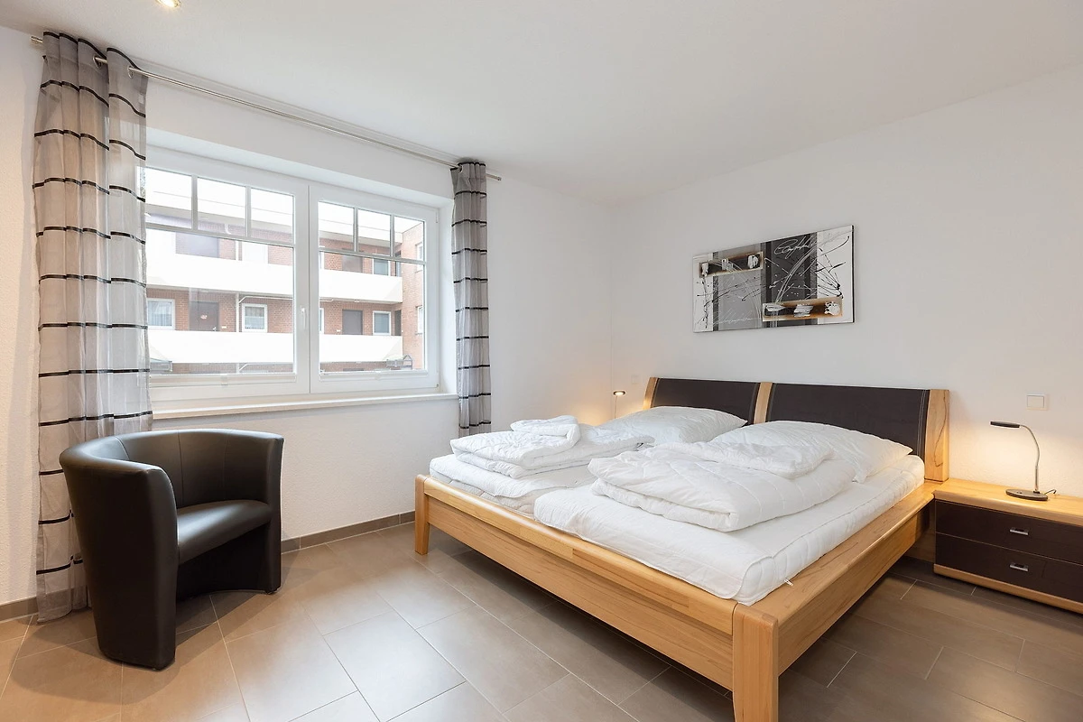 Separates, modern ausgestattetes Schlafzimmer mit einem Doppelbett und einem geräumigen Kleiderschrank. Das Fenster lässt sich durch einen elektrischen Aussenrolladen vollständig verdunkeln, ein Fliegenschutzgitter ist vorhanden. Das Schlafzimmer ist gefliest (Fussbodenheizung).