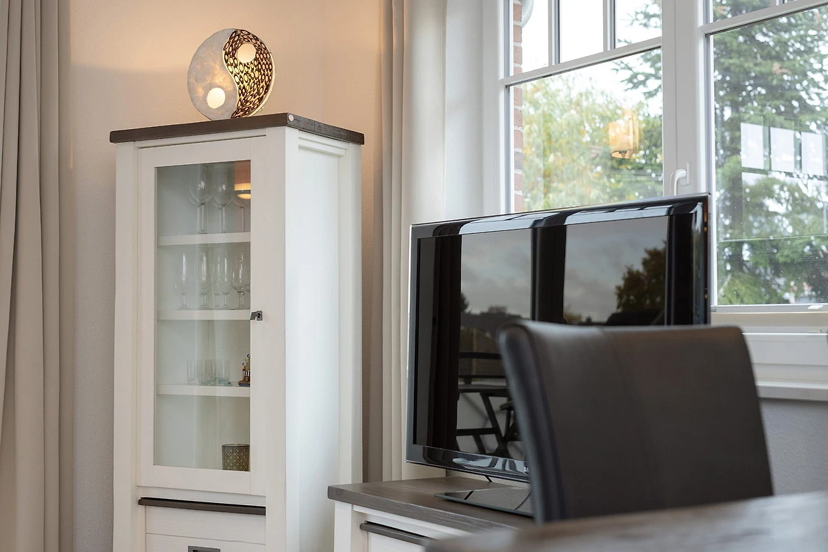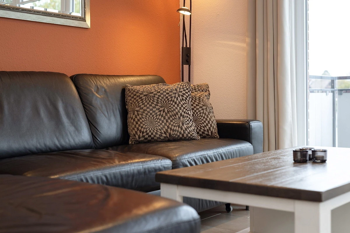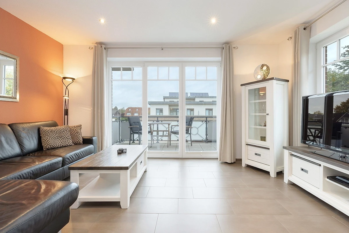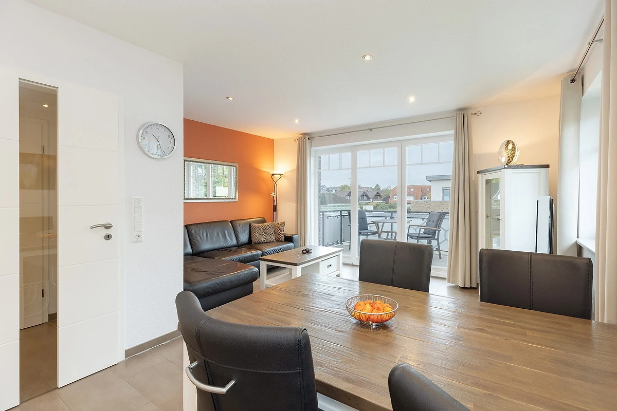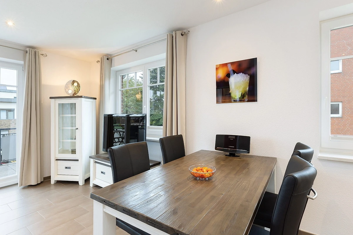 Wohn- und Esszimmer mit direktem Zugang zum Balkon. Das Wohn- und Esszimmer ist mit einem grossen Esstisch, einer Eckledercouch und einem Couchtisch ausgestattet. Zur Unterhaltung stehen ein Flachbildschirm mit TV-und Mediathek-Funktion sowie ein Radio zur Verfügung. Das Wohn- und Esszimmer ist gefliest (Fussbodenheizung).