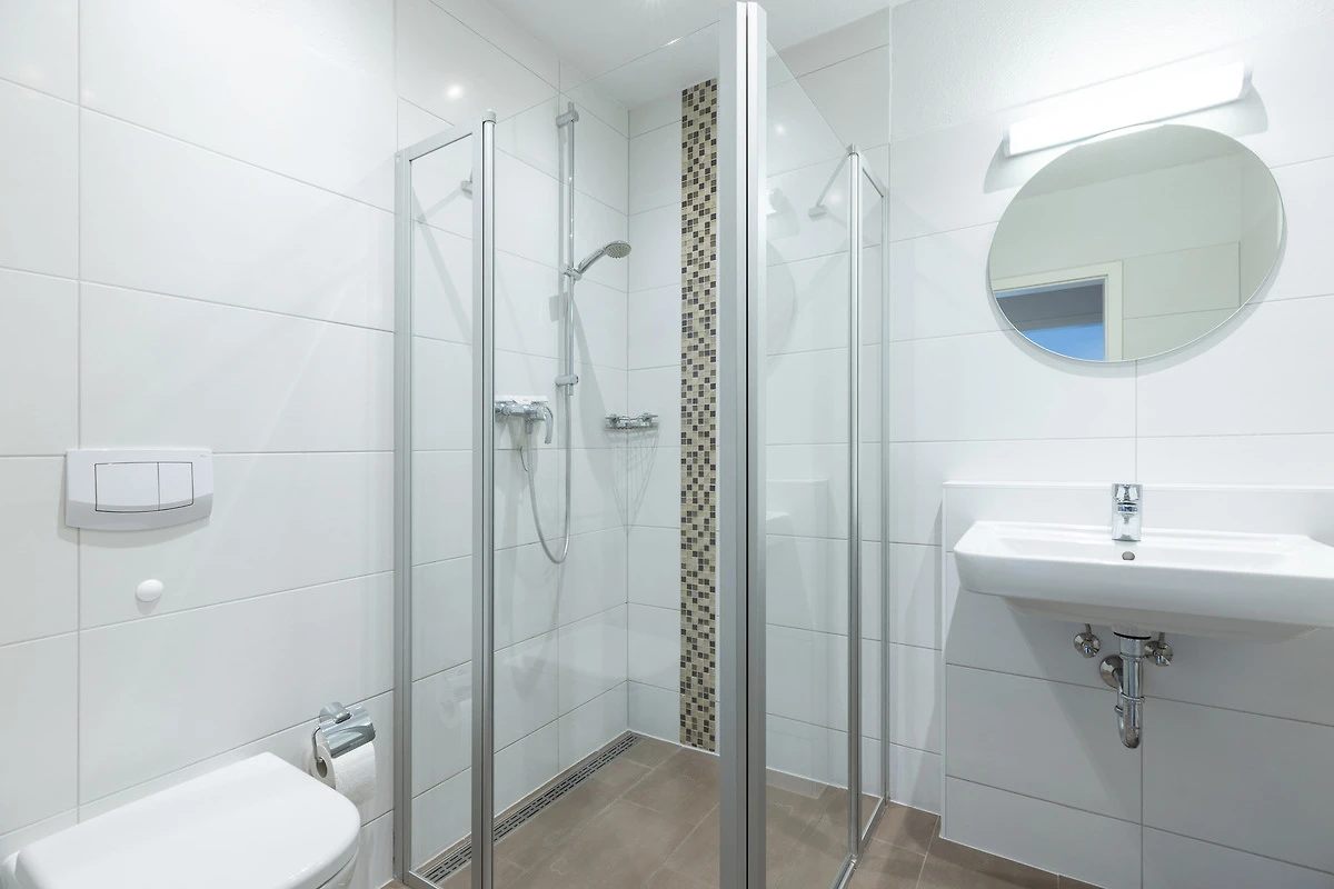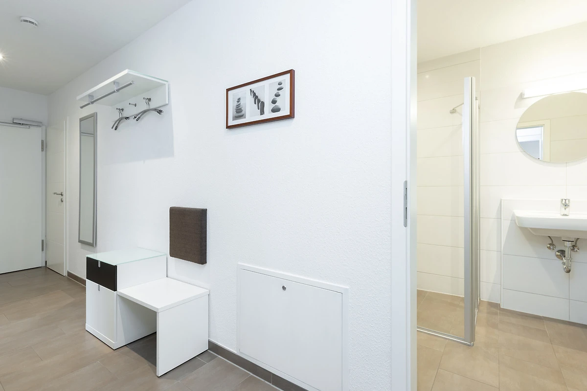 Hell gefliestes Bad mit ebenerdiger Dusche, WC und Waschbecken. Die Fussbodenheizung und die Handtuchheizung sorgen für angenehme Wärme.