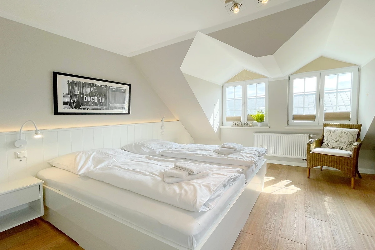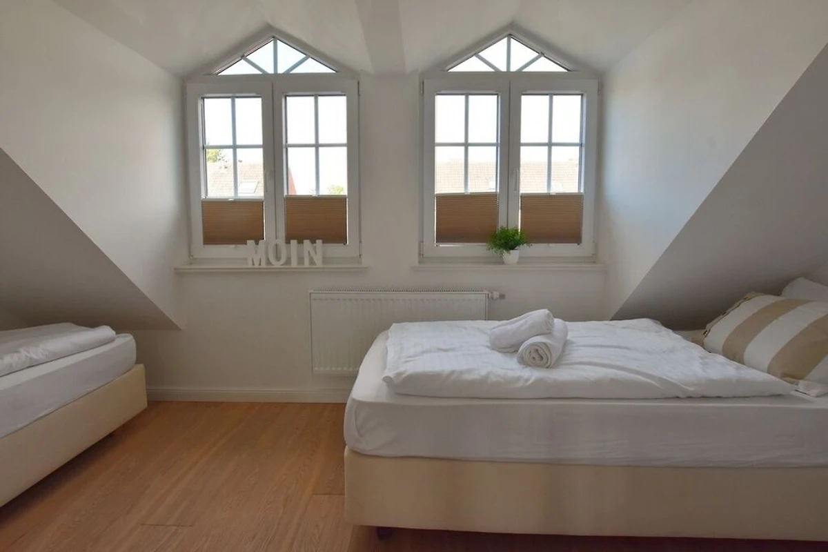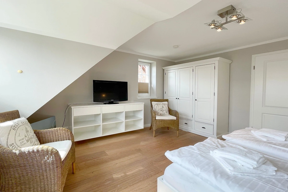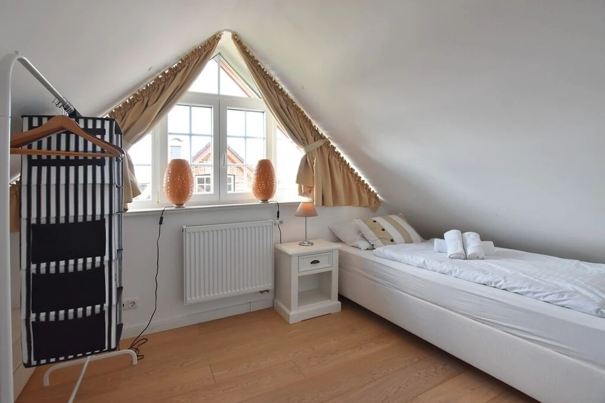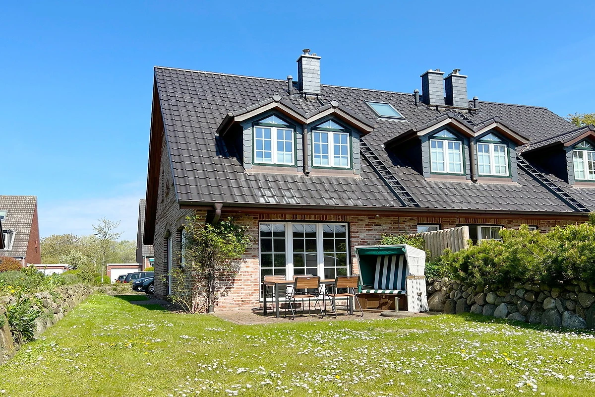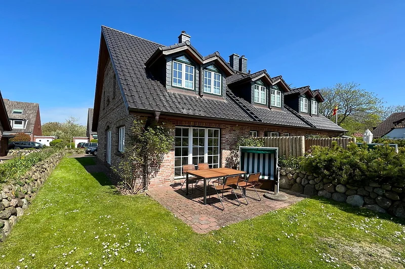 Das hier angebotene Ferienhaus[nbsp] verfügt über eine Terrasse sowie einen Garten, die beide in südlicher Ausrichtung liegen. Das Erdgeschoss des Hauses bietet ein Wohnzimmer mit gemütlicher Sitzgruppe und einem Kamin, eine Essecke, einen Fernseher sowie eine offene und gut ausgestattete Küche. Ausserdem ist hier ein Duschbad vorhanden. Im Obergeschoss befinden sich ein grosses Schlafzimmer mit einem Doppelbett und einem zweiten Fernseher sowie ein weiteres Schlafzimmer mit zwei getrennten Betten. Zusätzlich gibt es hier ein Wannenbad mit Duschmöglichkeit. Im Spitzboden des Hauses befindet sich ein weiteres Zimmer. Der Mindestaufenthalt während der Sommerferien beträgt 14 Übernachtungen, bei weniger Übernachtungen ist eine Anfrage möglich. An Sonn- und Feiertagen ist keine Abreisemöglichkeit gegeben. Gerne können wir Sie telefonisch unter der Nummer 04651 32973 beraten.