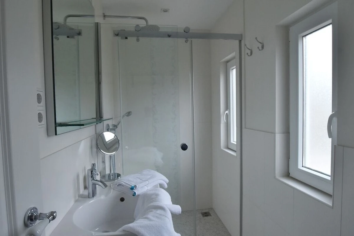 Ebenfalls im EG finden Sie ein Duschbad mit begehbarer bodentiefer Dusche, Waschbecken und WC.