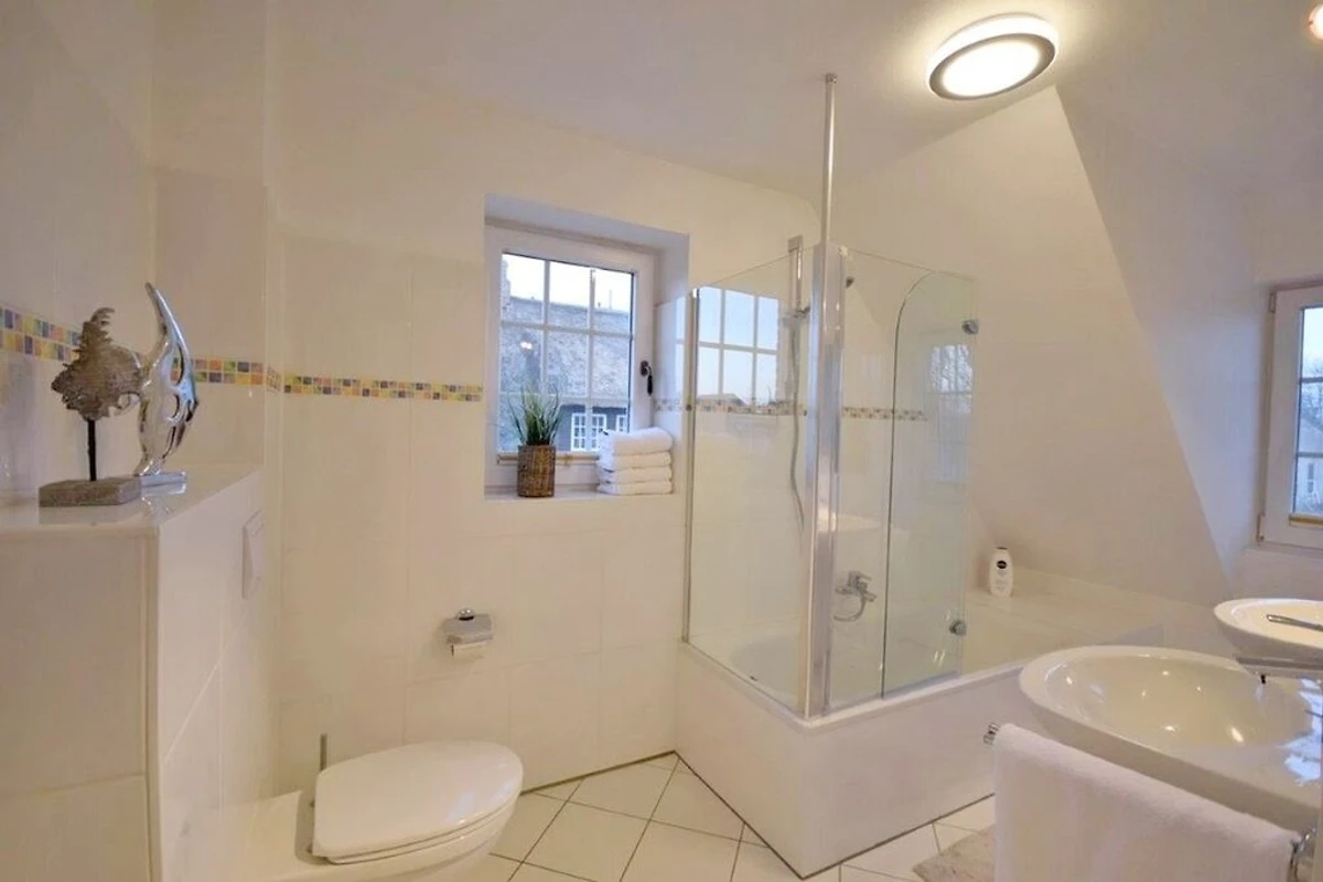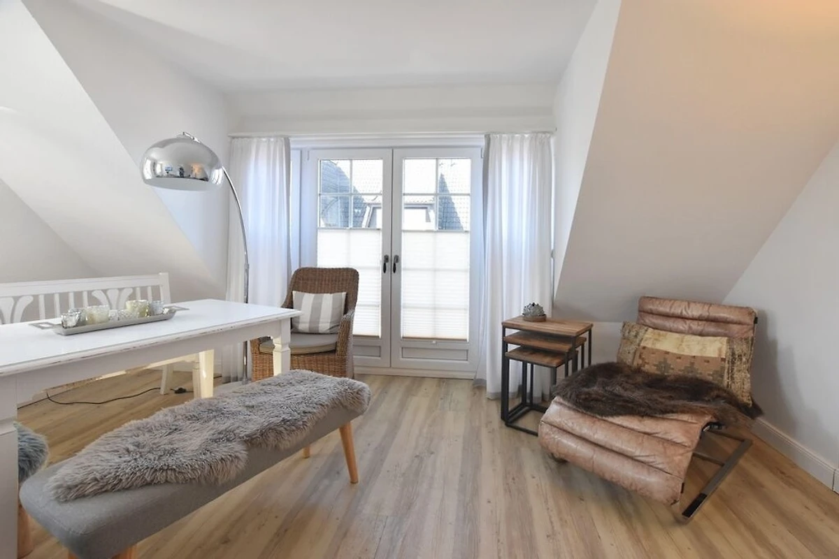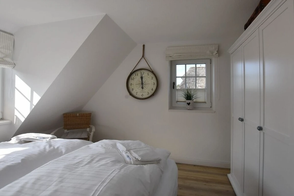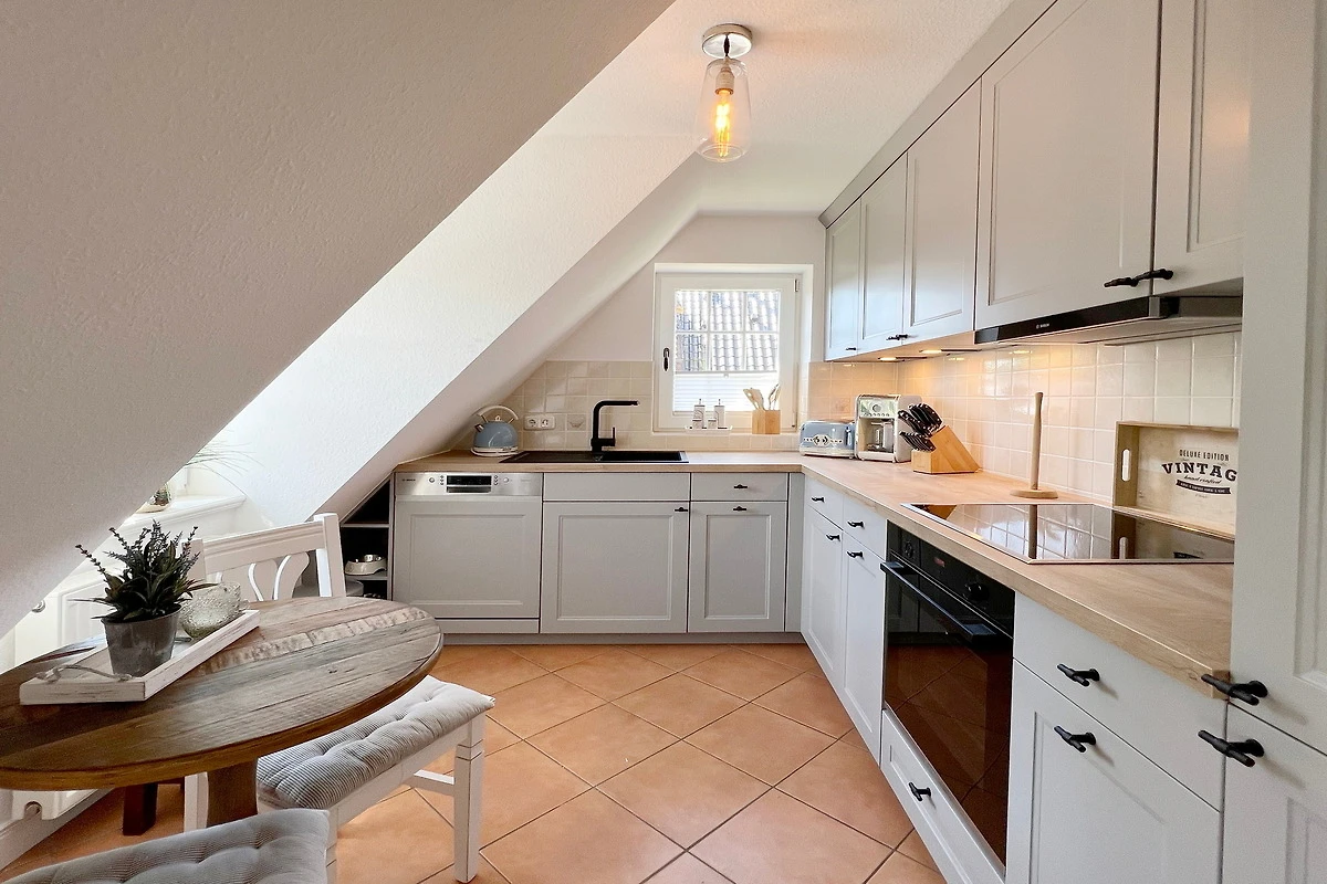 Die 4-Zimmer-Ferienwohnung mit West-Balkon befindet sich im Obergeschoss und Spitzboden des Hauses. Neben dem Elternschlafzimmer befinden sich 2 weitere kleine Schlafzimmer im SB für insgesamt 4 ( eventuell 5 ) Personen. Es gibt ein Wannenbad ( mit Duschmöglichkeit ) und ein Gäste-WC.