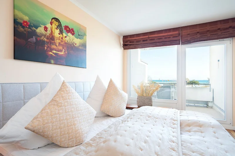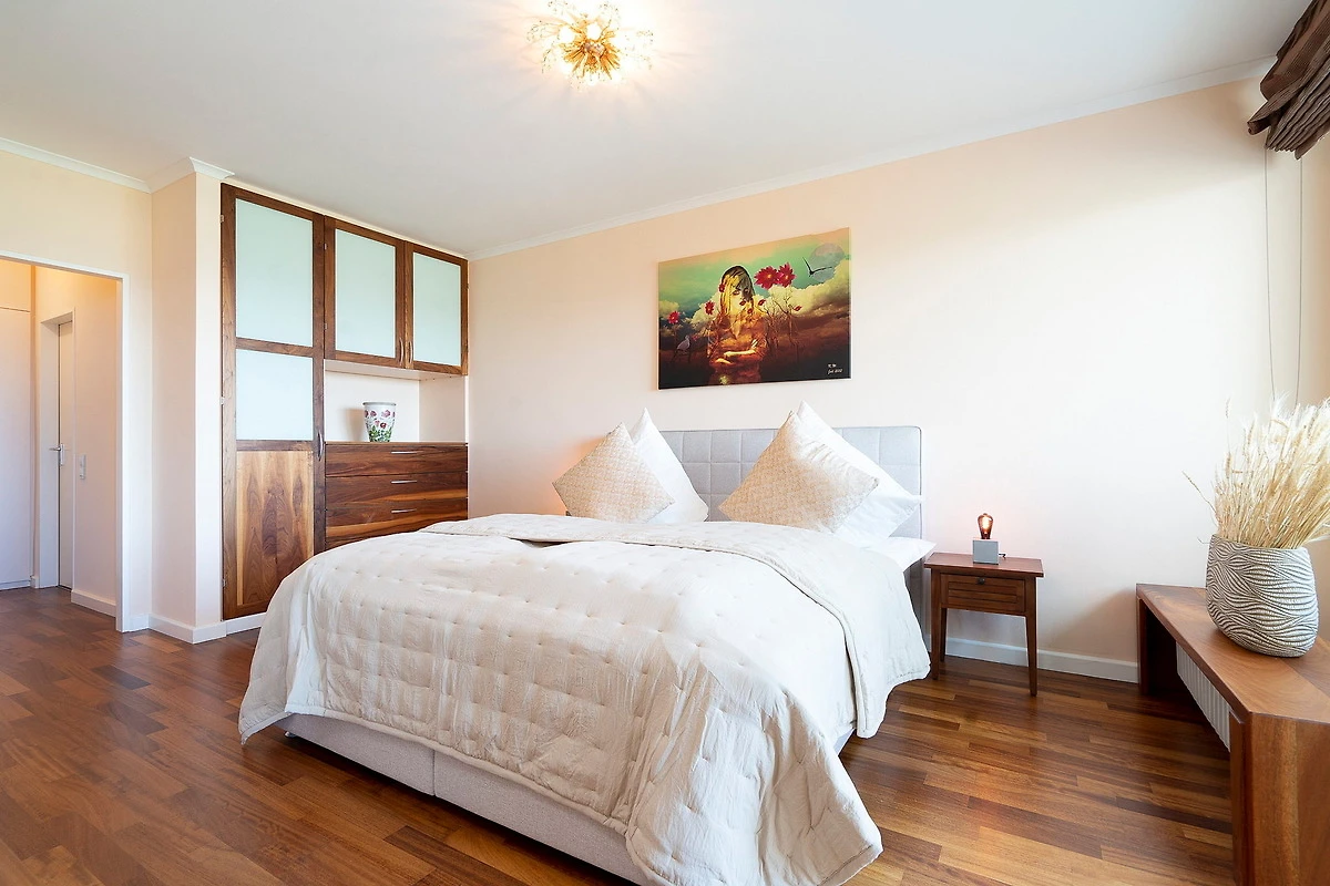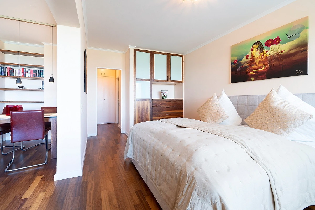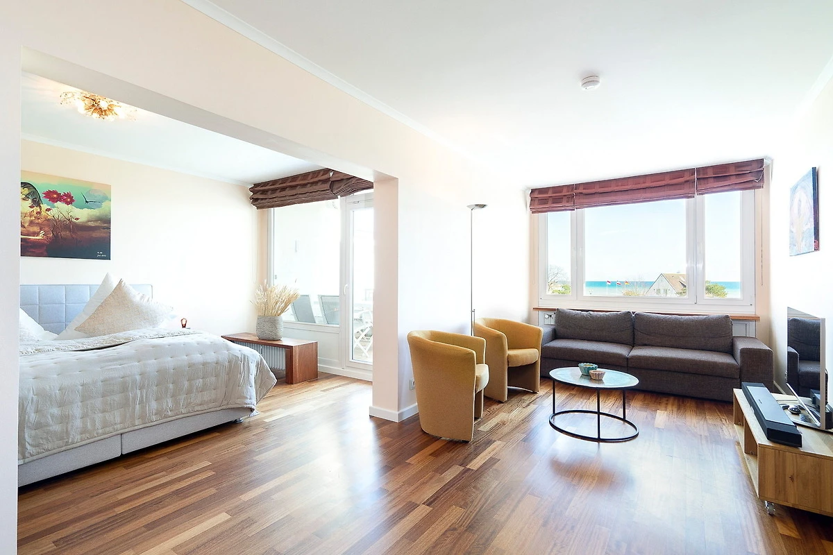 Grosszügiger Wohn-Schlafbereich mit direktem Zugang zum schönen Balkon mit Seeblick. Das Zimmer ist ausgestattet mit einem Boxspringbett (180x200cm) und einem Kleiderschrank, einer Schlafcouch und einem Essplatz für 4 Personen. Zur Unterhaltung steht ein Flachbild-TV und zur Verfügung. Der Boden ist mit Designplanken ausgelegt. Die Fenster lassen sich mit Gardinen stark verdunkeln.