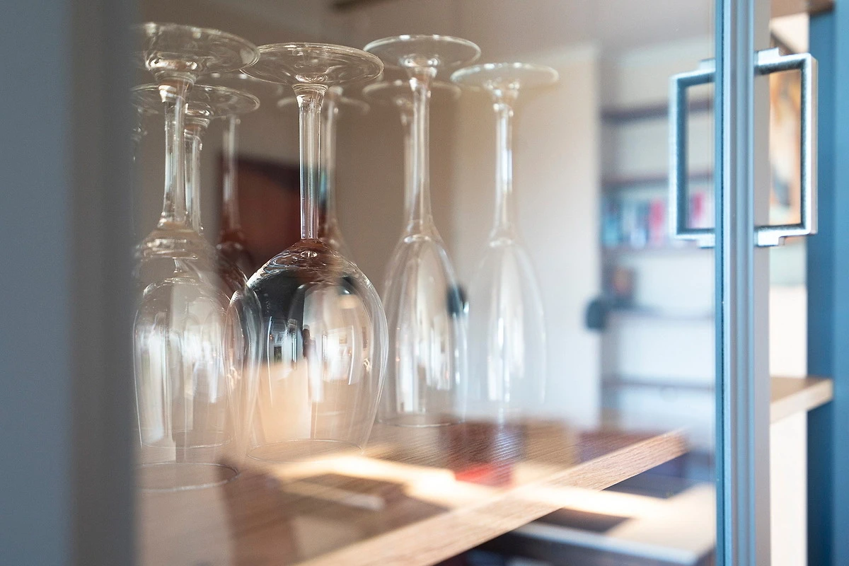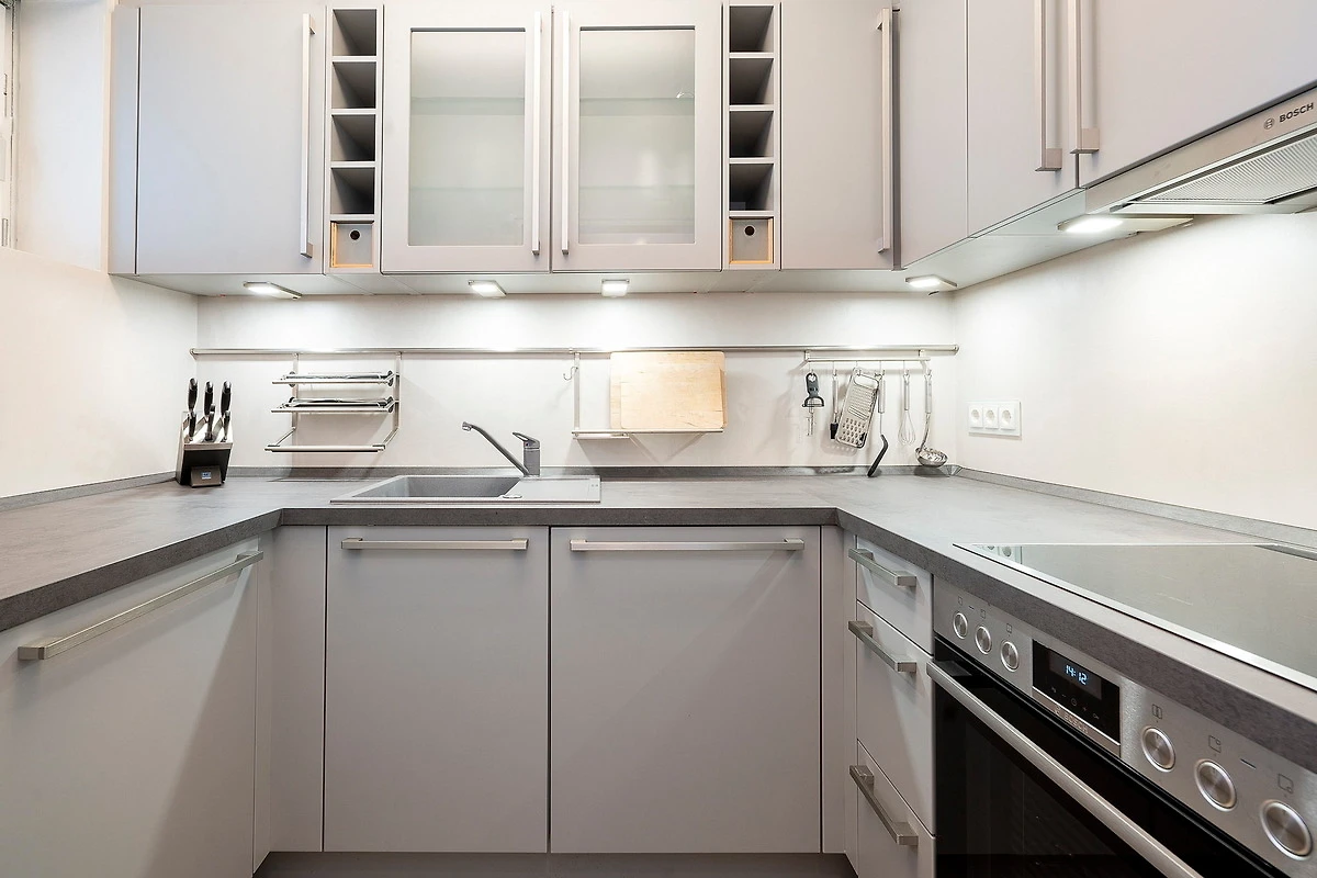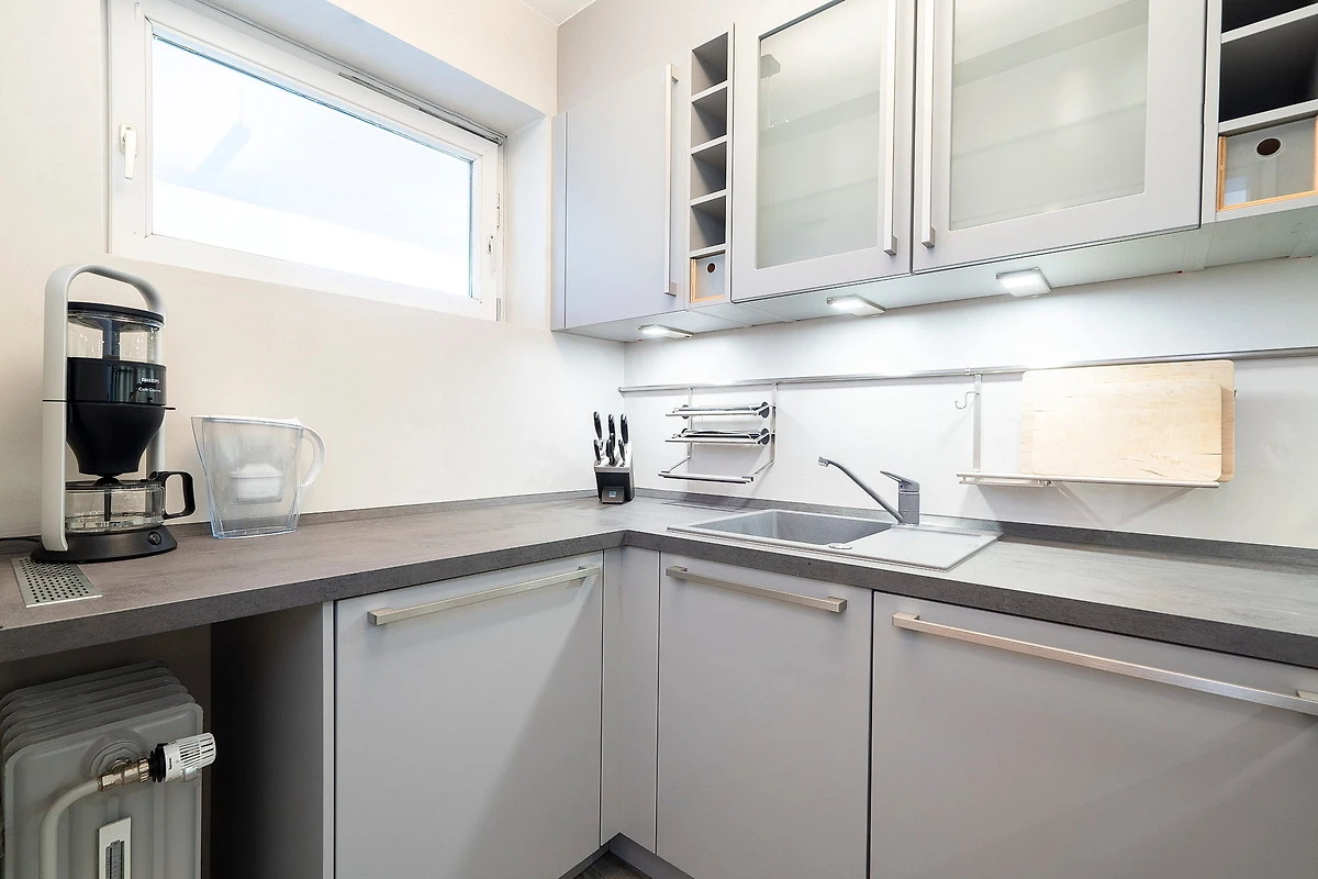 Komplett ausgestattete separate Küchenzeile mit 4-Platten Cerankochfeld, Spülmaschine, Backofen, Kühlschrank mit kleinem Gefrierfach. Ebenso stehen eine Kaffeemaschine, ein Toaster und ein Wasserkocher zur Verfügung.