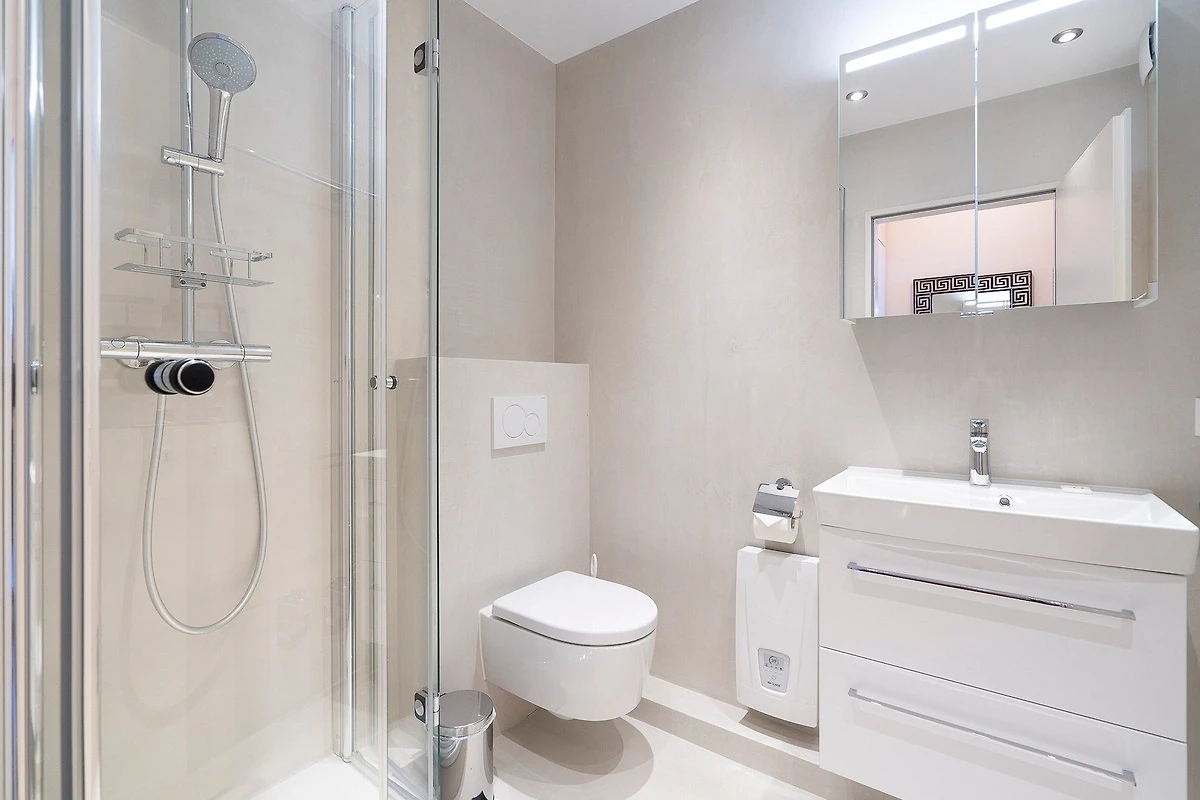 Helles modernes Bad mit Dusche, WC und Waschbecken.