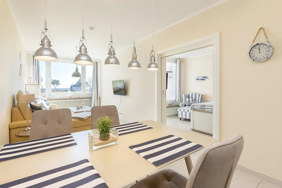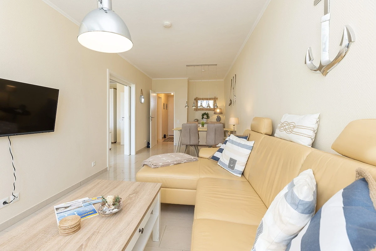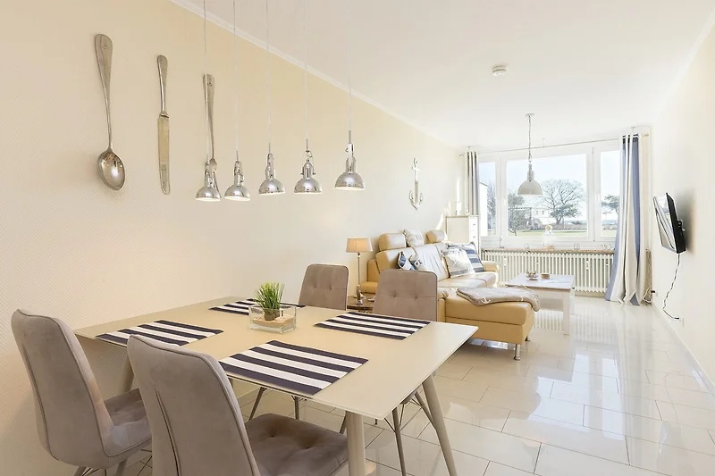 Moderner Wohnbereich mit Seeblick. Das Zimmer ist ausgestattet mit einer hellen Leder-Couch und einem Essplatz für 4 Personen sowie einer Kommode. Zur Unterhaltung steht ein Flachbild-TV zur Verfügung. Der Boden ist hell gefliest. Die Fenster lassen sich mit Aussen-Jalousien verdunkeln.