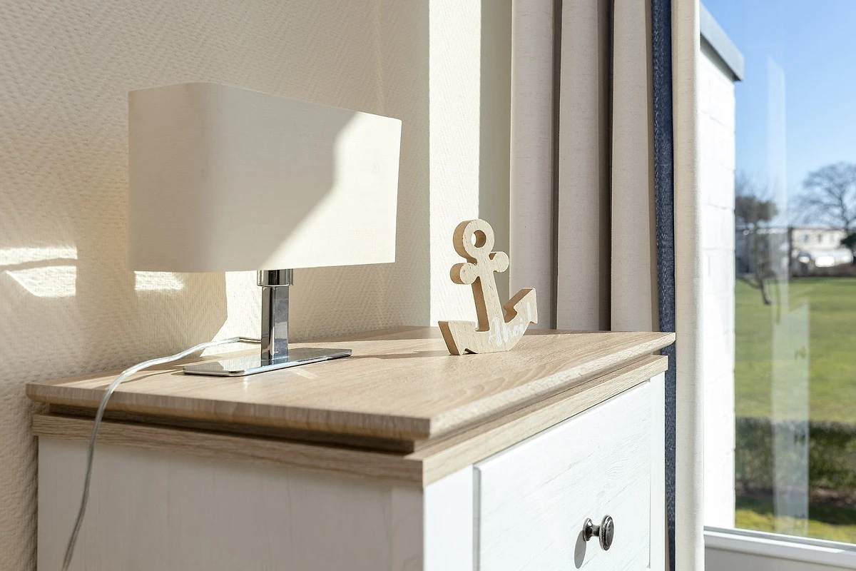 Kleines gemütlich eingerichtetes Schlafzimmer mit kleinem Kleiderschrank und direktem Zugang zum Balkon mit Seeblick. Das Zimmer ist hell gefliest und mit einem Doppelbett (2x90x200cm), einem Sessel sowie 2 Nachttischen ausgestattet. Zur Unterhaltung steht ein Flachbild-TV zur Verfügung. Die Fenster lassen sich mit Aussen-Jalousien verdunkeln.