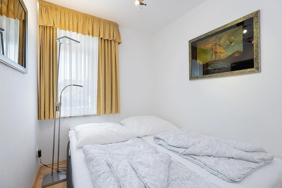 Sehr kleines, separates Schlafzimmer mit einem Doppelbett (2x 80x200cm). Das Schlafzimmer ist mit Laminatboden ausgelegt. Das Fenster lässt sich durch einen blickdichten Vorhang verdunkeln.