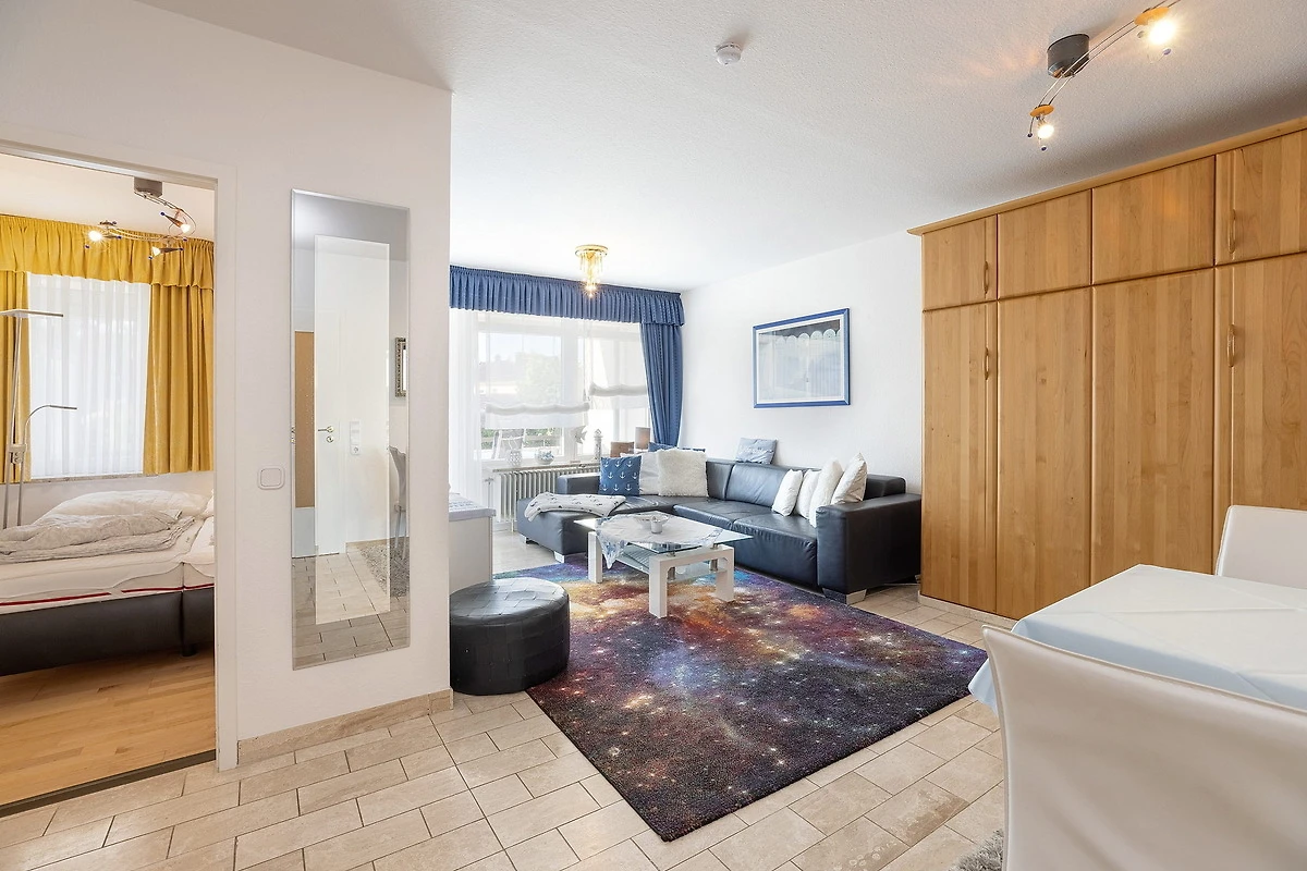 Modernes, freundliches Wohn- und Esszimmer mit direktem Zugang zum grossen Balkon. Das Wohn- und Esszimmer ist mit einem Essplatz für 4 Personen, einer Eckcouch und einem Sessel, einem Couchtisch und einen Schrankbett (2x 80x200cm) und einem Kleiderschrank ausgestattet. Zur Unterhaltung steht ein Fernseher zur Verfügung. Das Wohn- und Esszimmer ist gefliest, das Fenster lässt sich durch eine blickdichte Gardine verdunkeln.