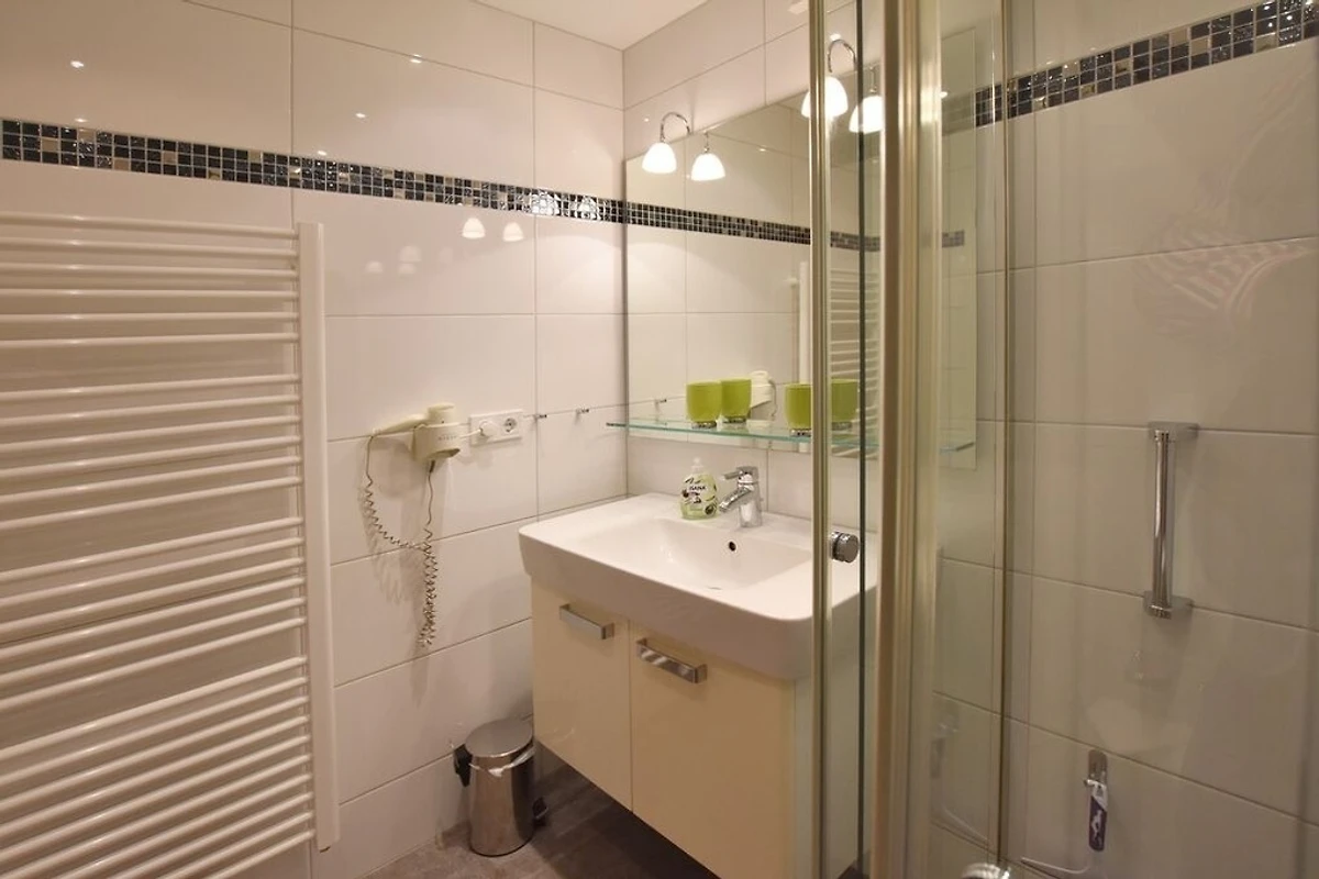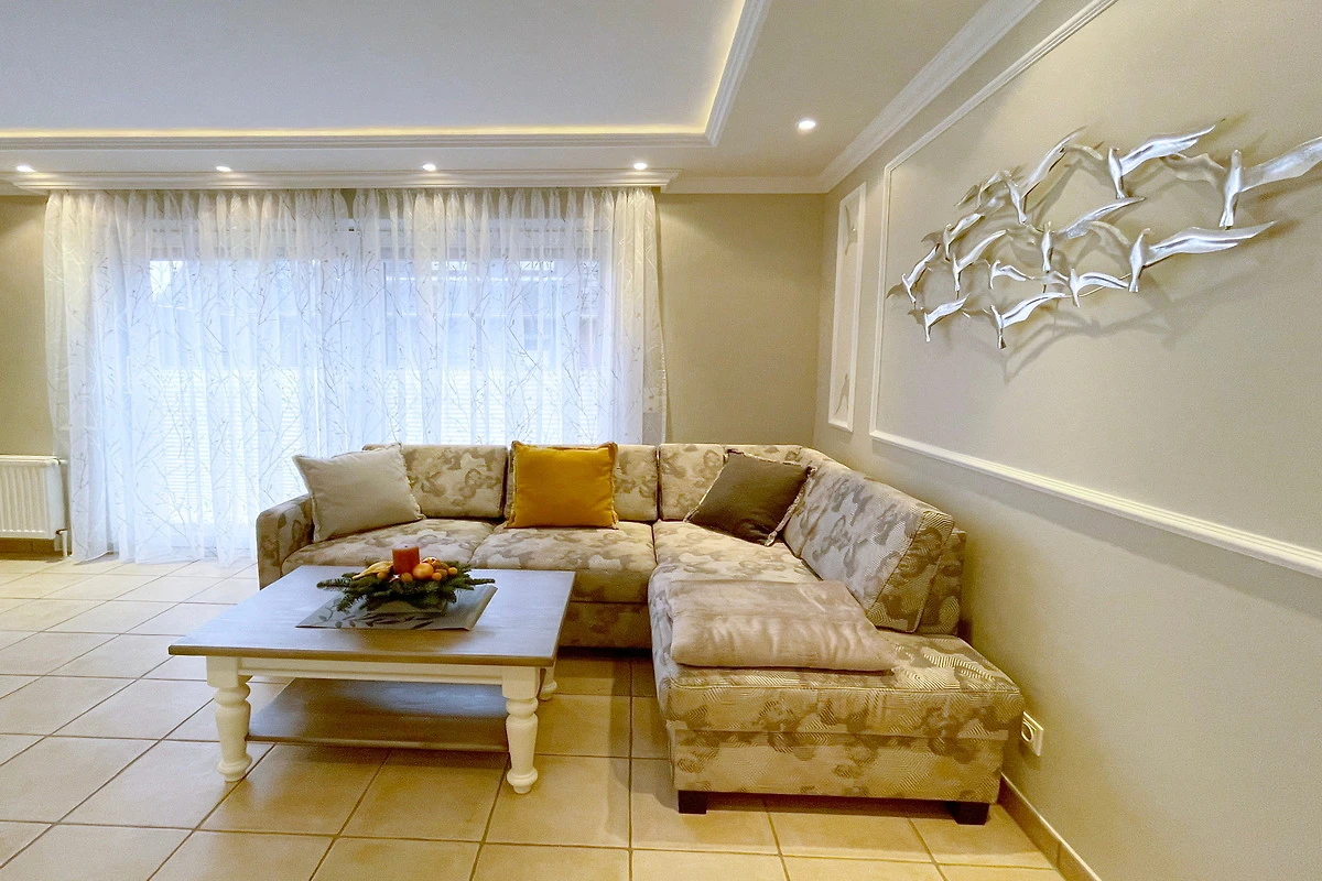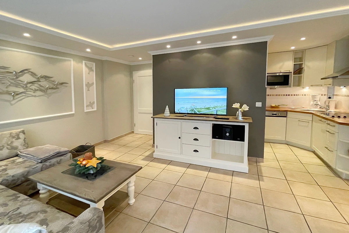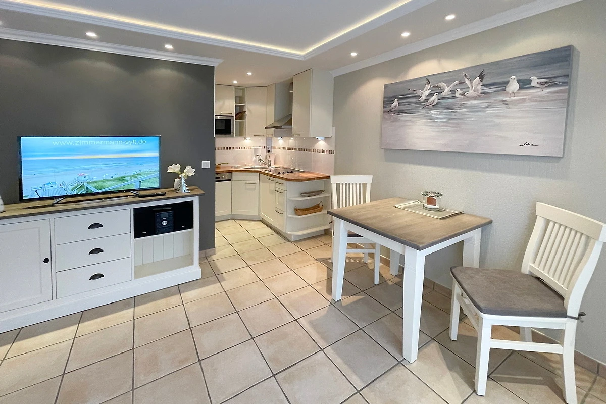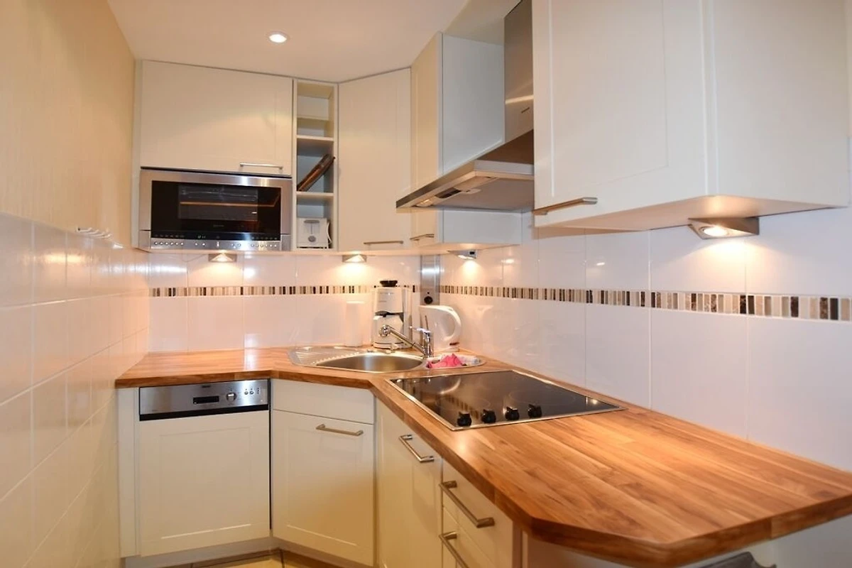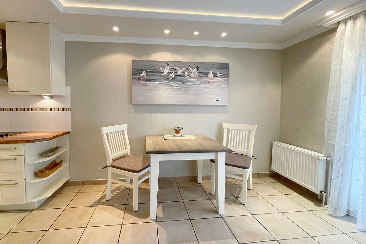 Moderne Ferienwohnung im Erdgeschoss mit Terrasse in südlicher Ausrichtung. Wohnzimmer mit gemütlicher Couch, Essecke für 2 Personen und offener Küchenzeile mit Geschirrspüler und Mikrowelle. Smart-TV und WLAN gehören hier zur Ausstattung. Schlafzimmer mit Doppelbett und zweitem TV. Duschbad mit WC und Waschbecken. Zur Ferienwohnung gehört ein PKW-Stellplatz ( Nr. 2 ) auf dem Grundstück. Im UG befinden sich für die Gäste des Hauses Waschmaschine und Trockner, Nutzung gegen geringe Gebühr. Gerne dürfen Sie hier ein gut erzogenes Haustier mitbringen. Dafür wird dann eine einmalige Haustiergebühr berechnet.