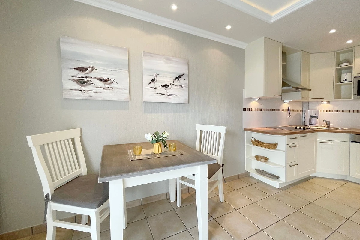 Moderne Ferienwohnung im Erdgeschoss mit Terrasse in südlicher Ausrichtung. Wohnzimmer mit gemütlicher Couch, Essecke für 2 Personen und offener Küchenzeile mit Geschirrspüler und Mikrowelle. Smart-TV und WLAN gehören hier zur Ausstattung. Schlafzimmer mit Doppelbett und zweitem TV. Duschbad mit WC und Waschbecken. Zur Ferienwohnung gehört ein PKW-Stellplatz ( Nr. 3 ) auf dem Grundstück. Im UG befinden sich für die Gäste des Hauses Waschmaschine und Trockner, Nutzung gegen geringe Gebühr. Gerne dürfen Sie hier ein gut erzogenes Haustier mitbringen. Dafür wird dann eine einmalige Haustiergebühr berechnet.