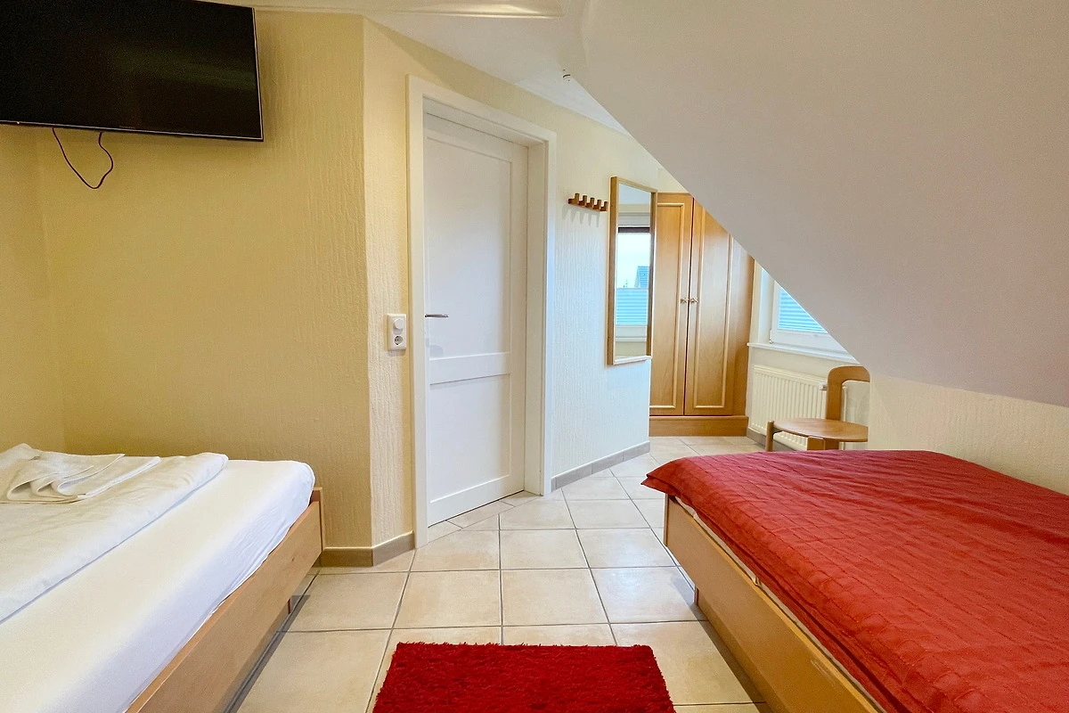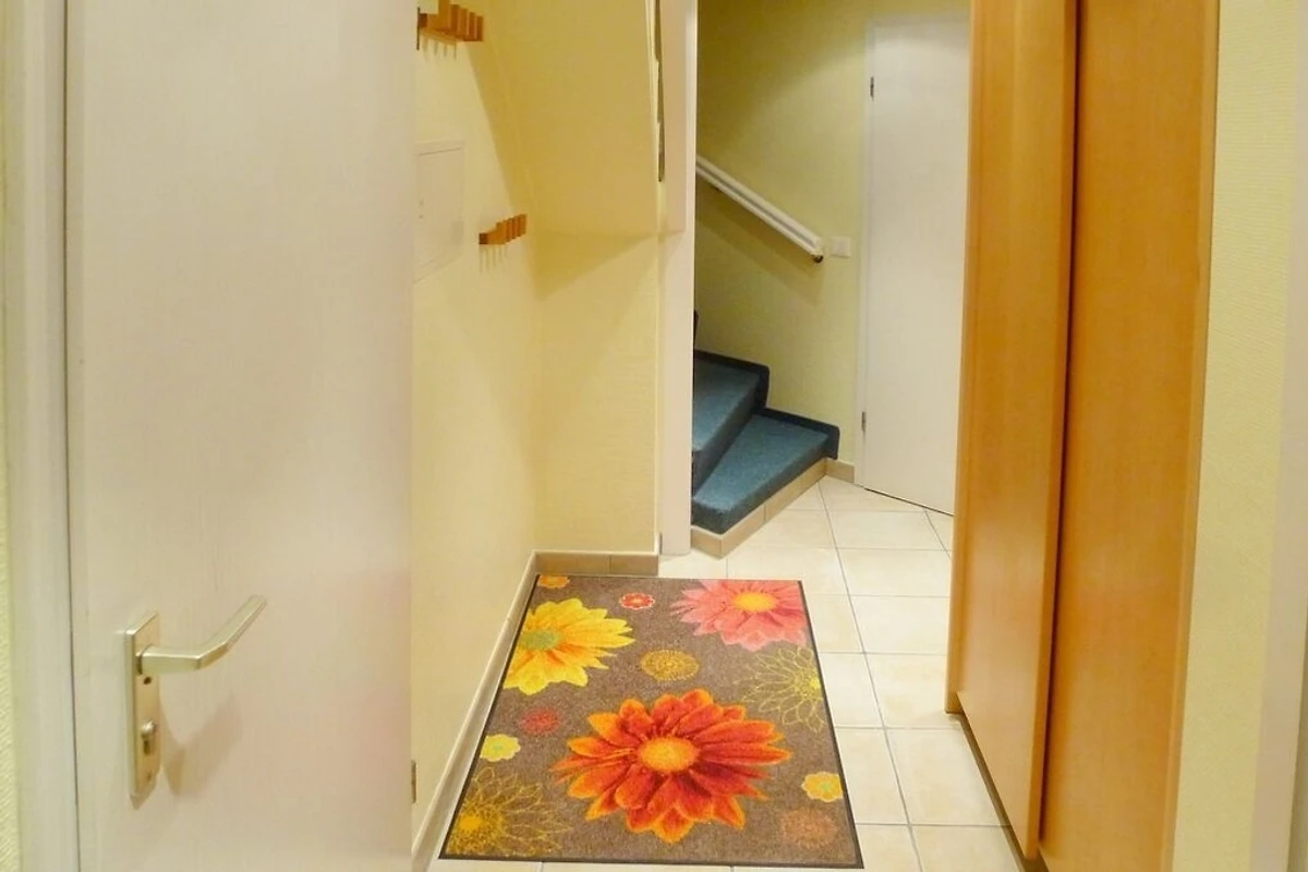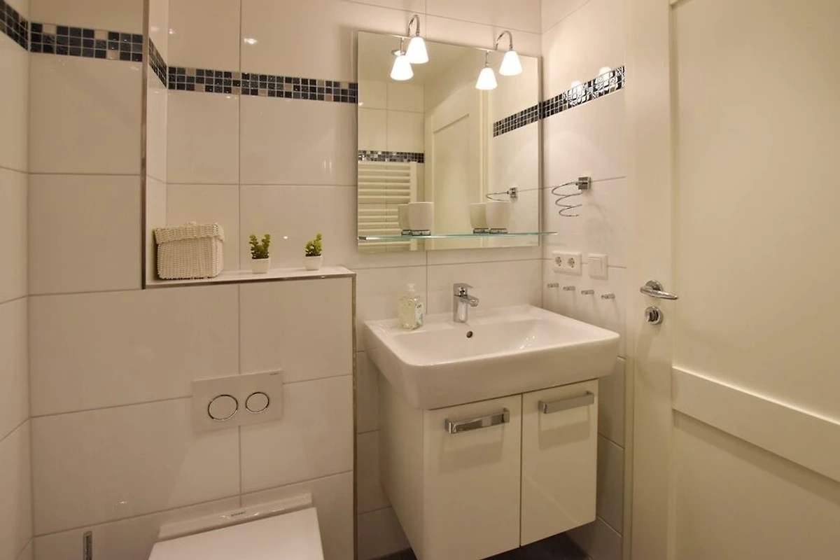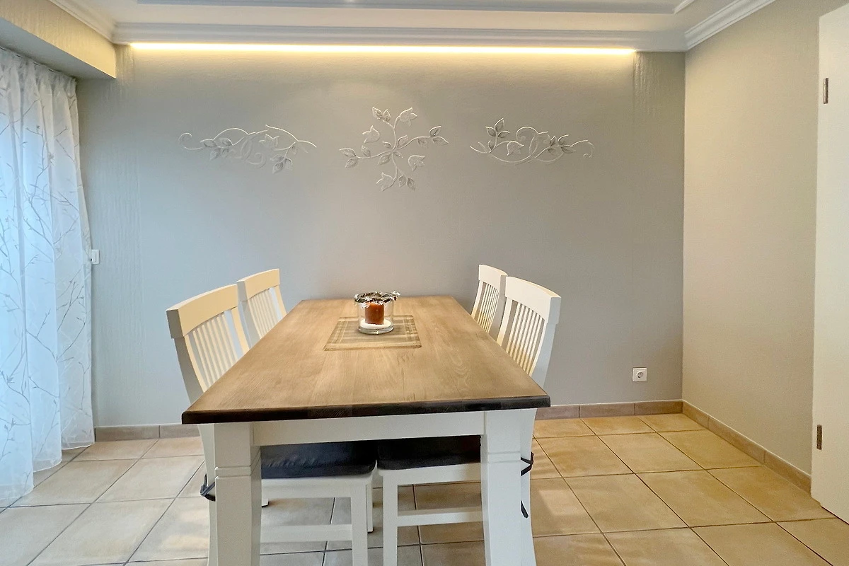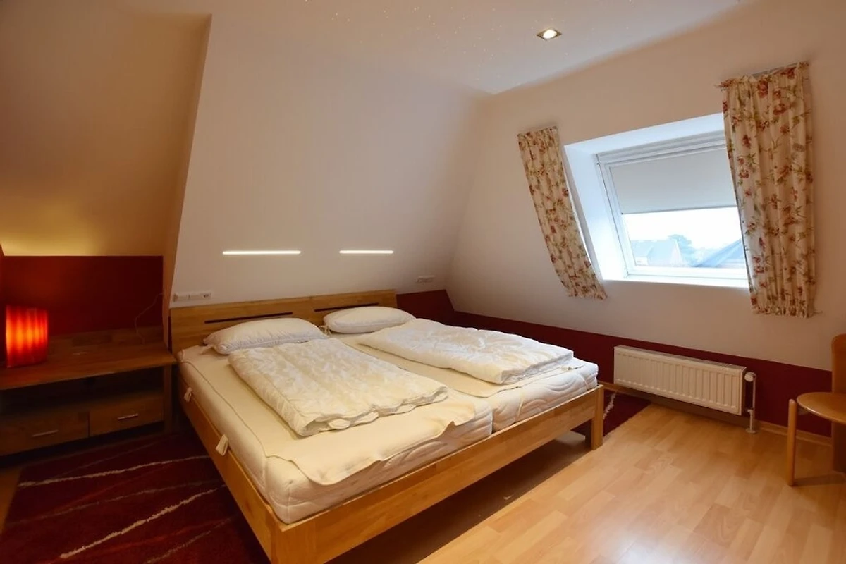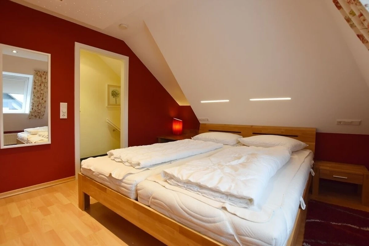 3 Zimmerwohnung mit Balkon (OG und DG), Wohnzimmer mit gemütlicher Sitzgruppe und Essecke, offene Küche mit Cerankochfeld, und Geschirrspüler, Flatscreen-TV, 2 Schlafzimmer für je 2 Personen mit jeweils eigenem Badezimmer mit Dusche WC und Waschbecken, im UG befinden sich für die Gäste des Hauses Waschmaschine und Trockner gegen Gebühr. 1 PKW-Stellplatz. Gerne dürfen Sie hier ein gut erzogenes Haustier mitbringen. Dafür wird dann eine einmalige Haustiergebühr berechnet.