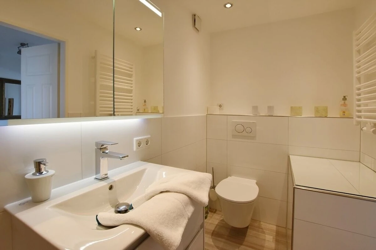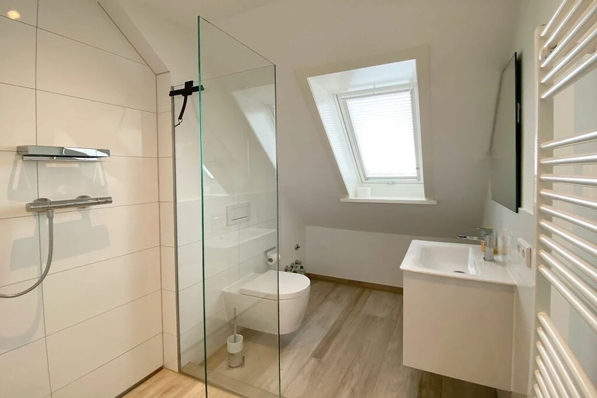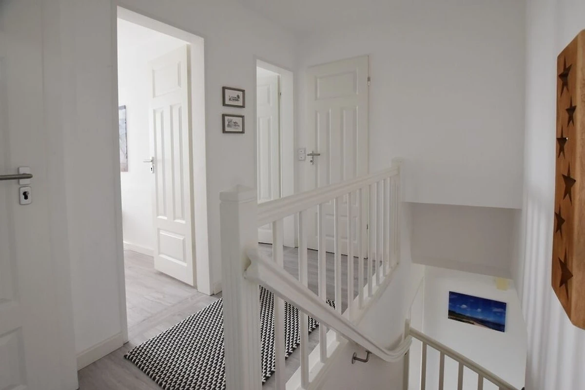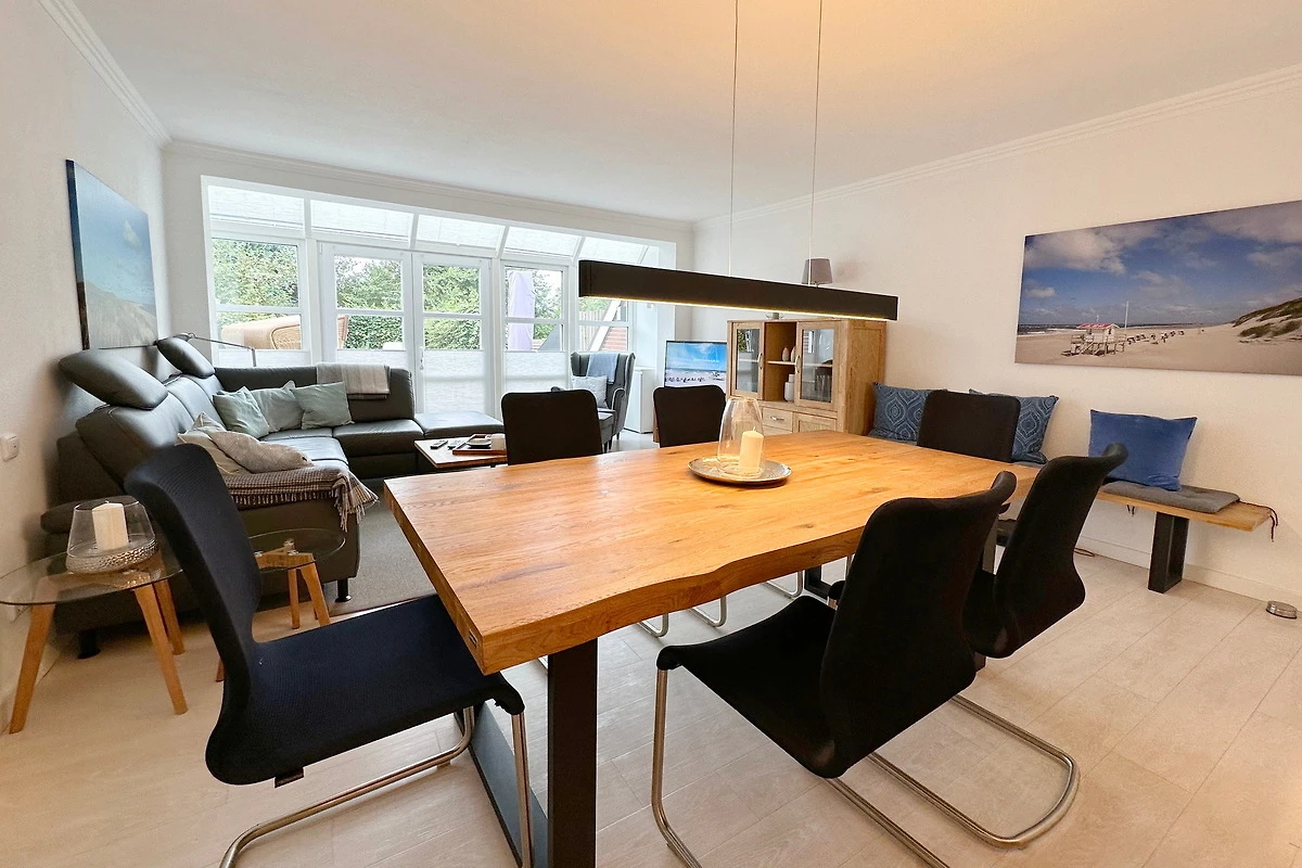 Reihenhaus mit Terrasse nach Süden, Wohnzimmer mit Wintergarten, gemütliche Essecke und Fernseher, Sitzgruppe, Küche mit Geschirrspüler, Backofen, Mikrowelle, Waschmaschine und Trockner, 3 Schlafzimmer für je 2 Personen, neues Bad mit begehbarer Dusche, WC und Waschbecken, 1 Gäste- WC, im Spitzboden befindet sich ein zusätzlicher Raum mit Doppelbett und einem zweitem Duschbad mit WC.