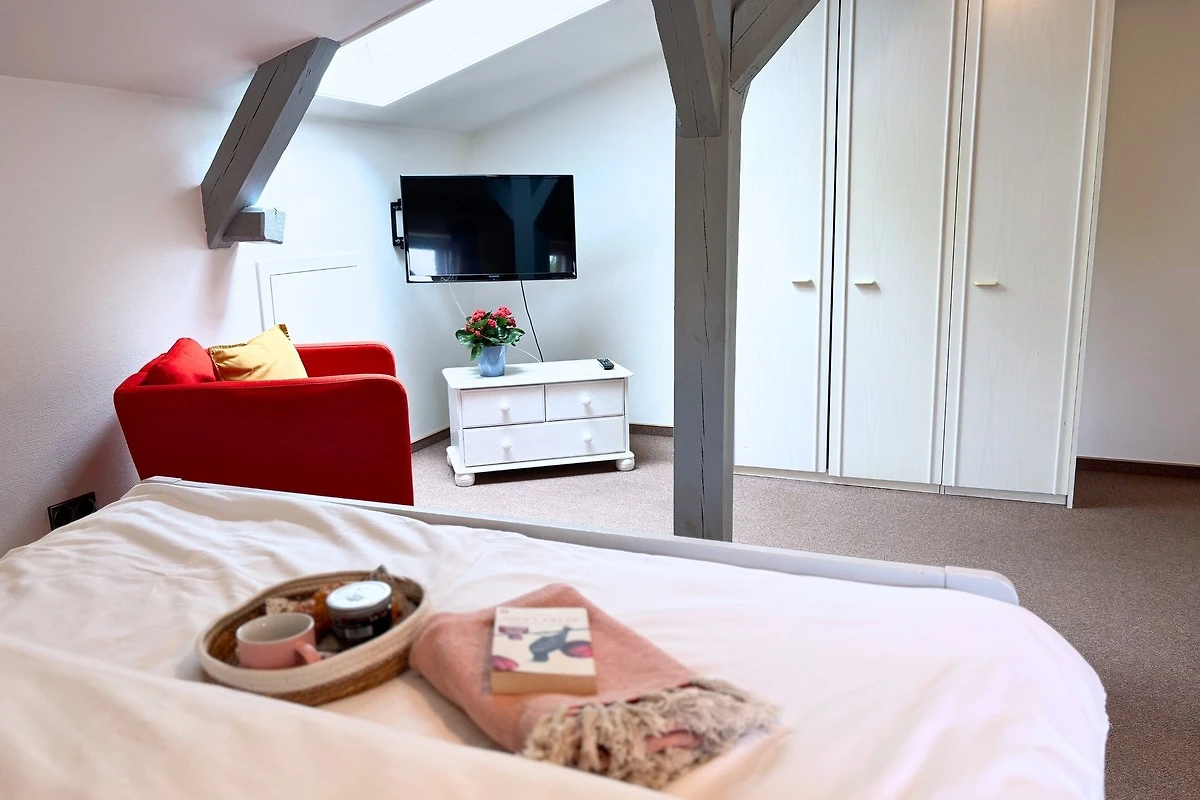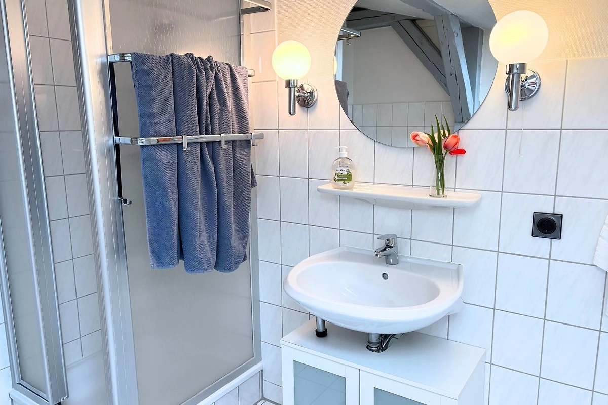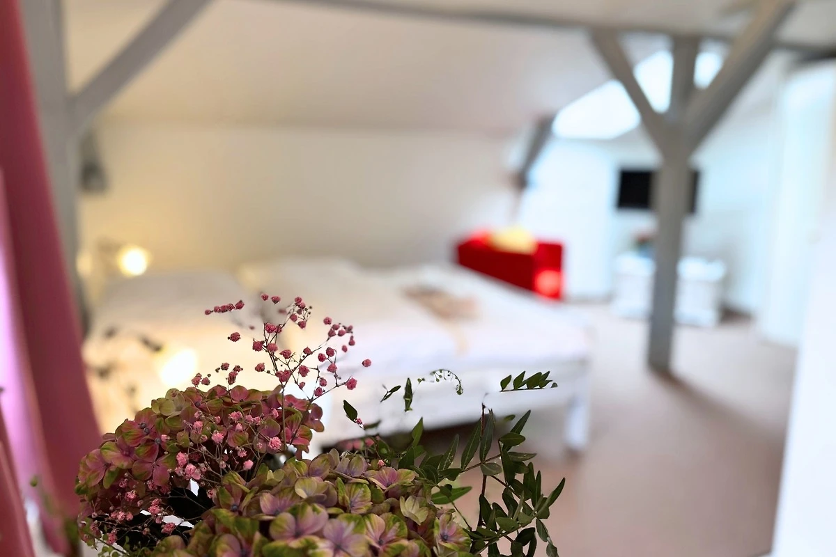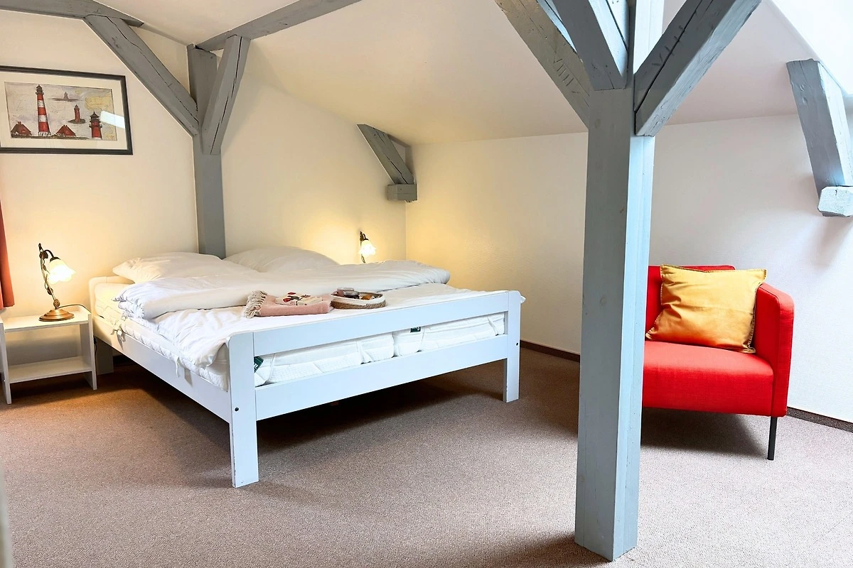 Die Kleene Helene ist unser kleines Kuschelapartment. Die charmante 1-Raumwohnung befindet sich im Obergeschoss des alten Bauernhauses. Sie ist wohl die gemütlichste unserer Ferienwohnungen. Klein aber fein. Perfekt für eine Auszeit zu zweit.