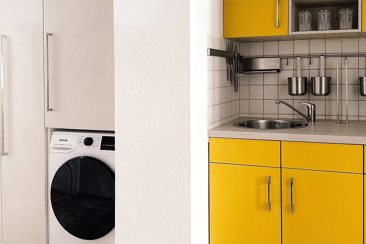 Die Ausstattung des Apartments umfasst ein gemütliches Wohnzimmer. Die offene Küche ist mit einer Mikrowelle sowie Küchenutensilien ausgestattet. Für längere Aufenthalte befinden sich auch ein Trockner und eine Waschmaschine in der Ferienunterkunft.